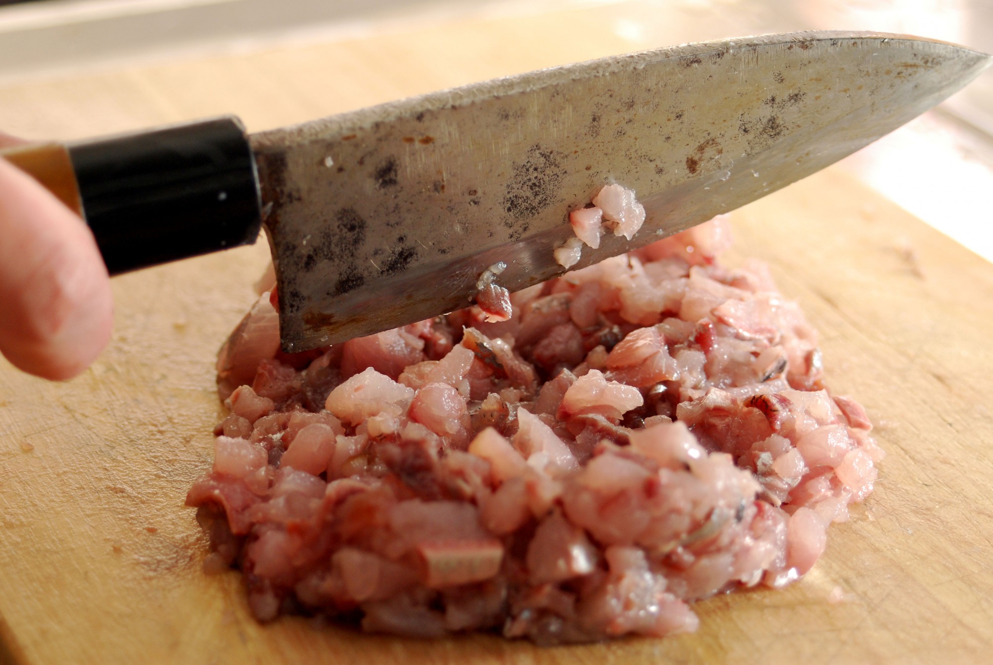 すべてのいわしの頭と内臓、中骨、皮を取り除いたら、包丁でたたいて細かくします。たたく際に一つまみの塩(分量外)を加えて下味をつけておくといいですよ。