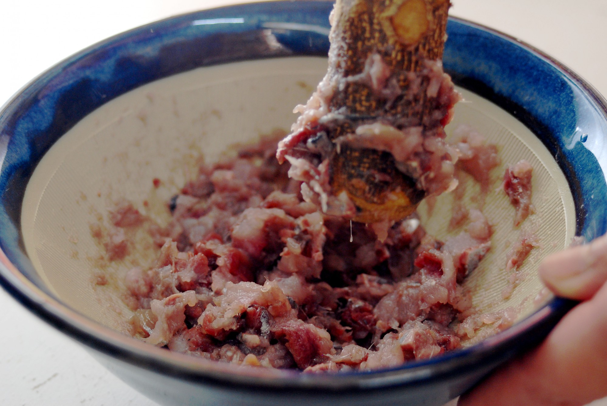いわしの身が細かくなったら、次はすり鉢を使ってなめらかにします。味噌と溶き卵を加えてすりつぶしましょう。お好みの加減でなめらかさを調整したら、いわし団子の準備は完了です。