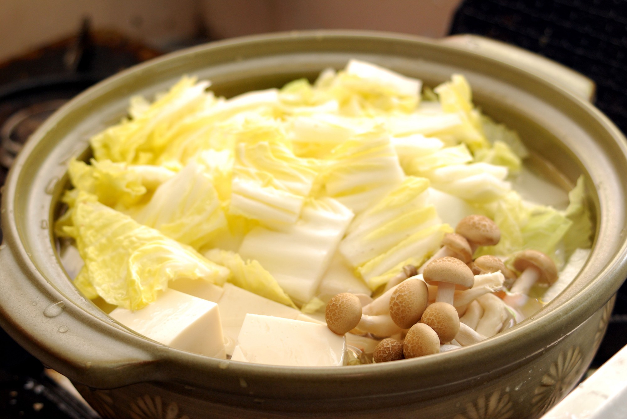 にんじん、大根はいちょう切りに。木綿豆腐は一口大の四角形、あるいは手でちぎって鍋に入れても構いません。しめじは石づきを切り落とします。水菜は4cm程度の食べやすいサイズに、白菜も一口サイズにカットしましょう。