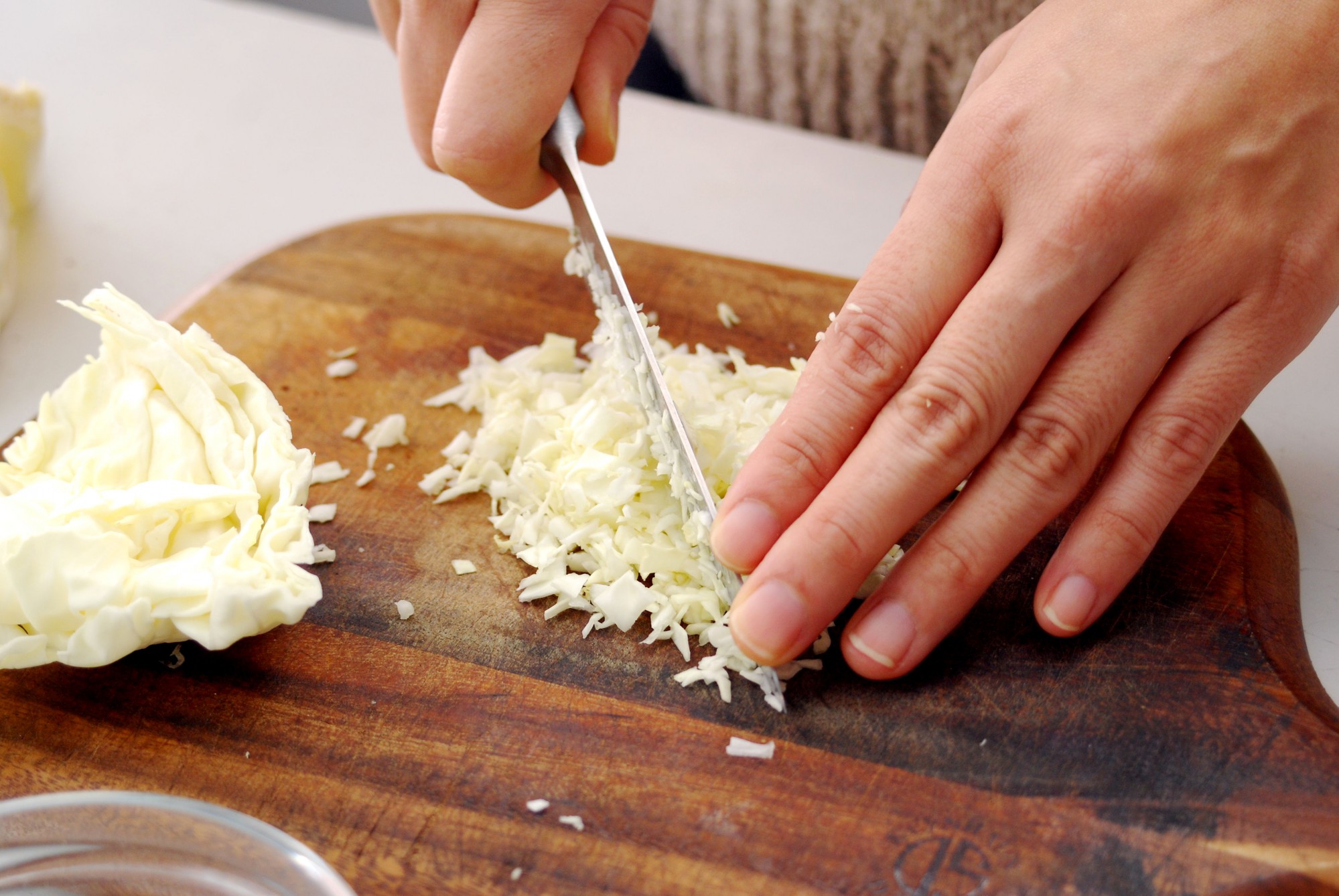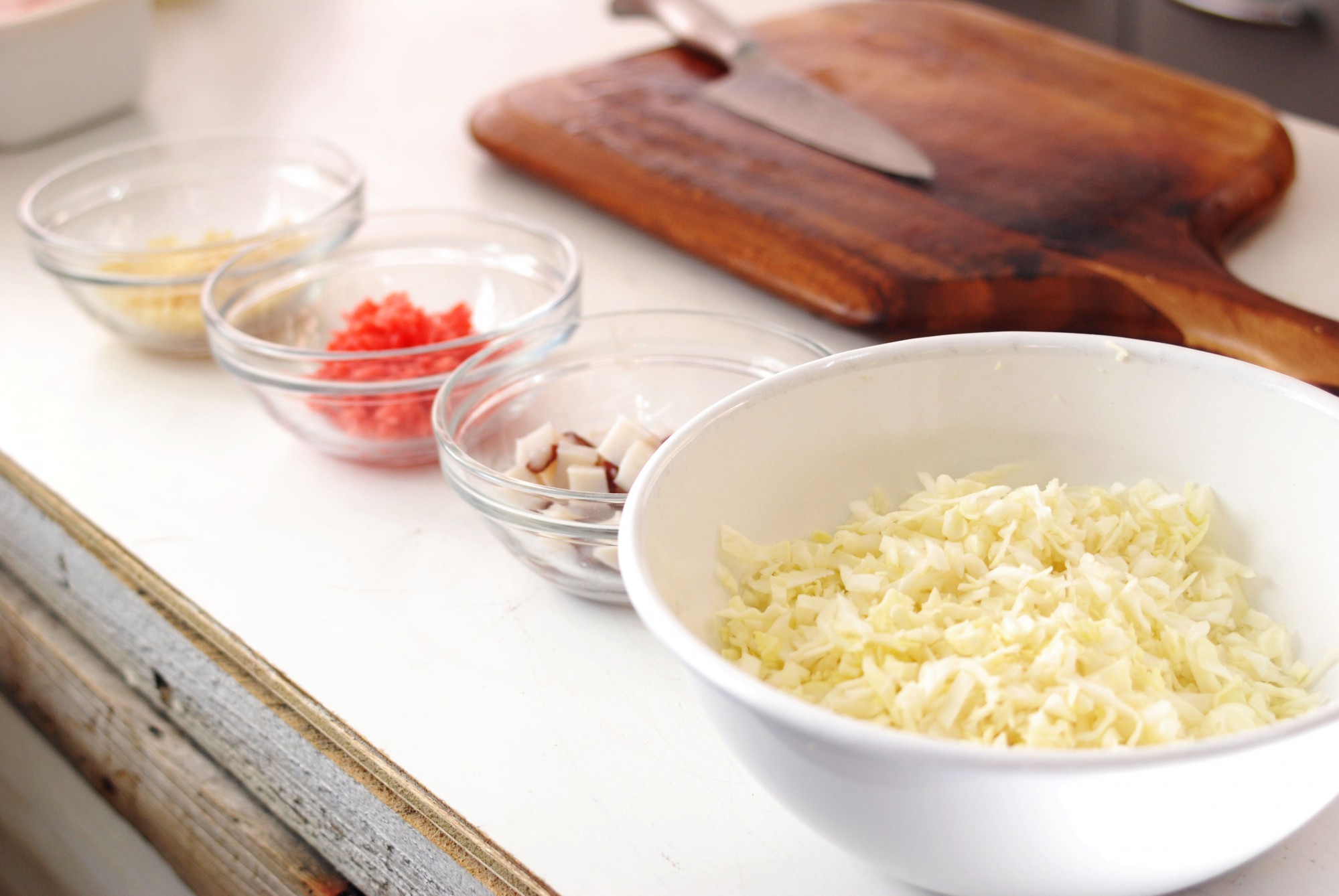 キャベツ、紅生姜をみじん切りにし、タコを食べやすいサイズにカットします。