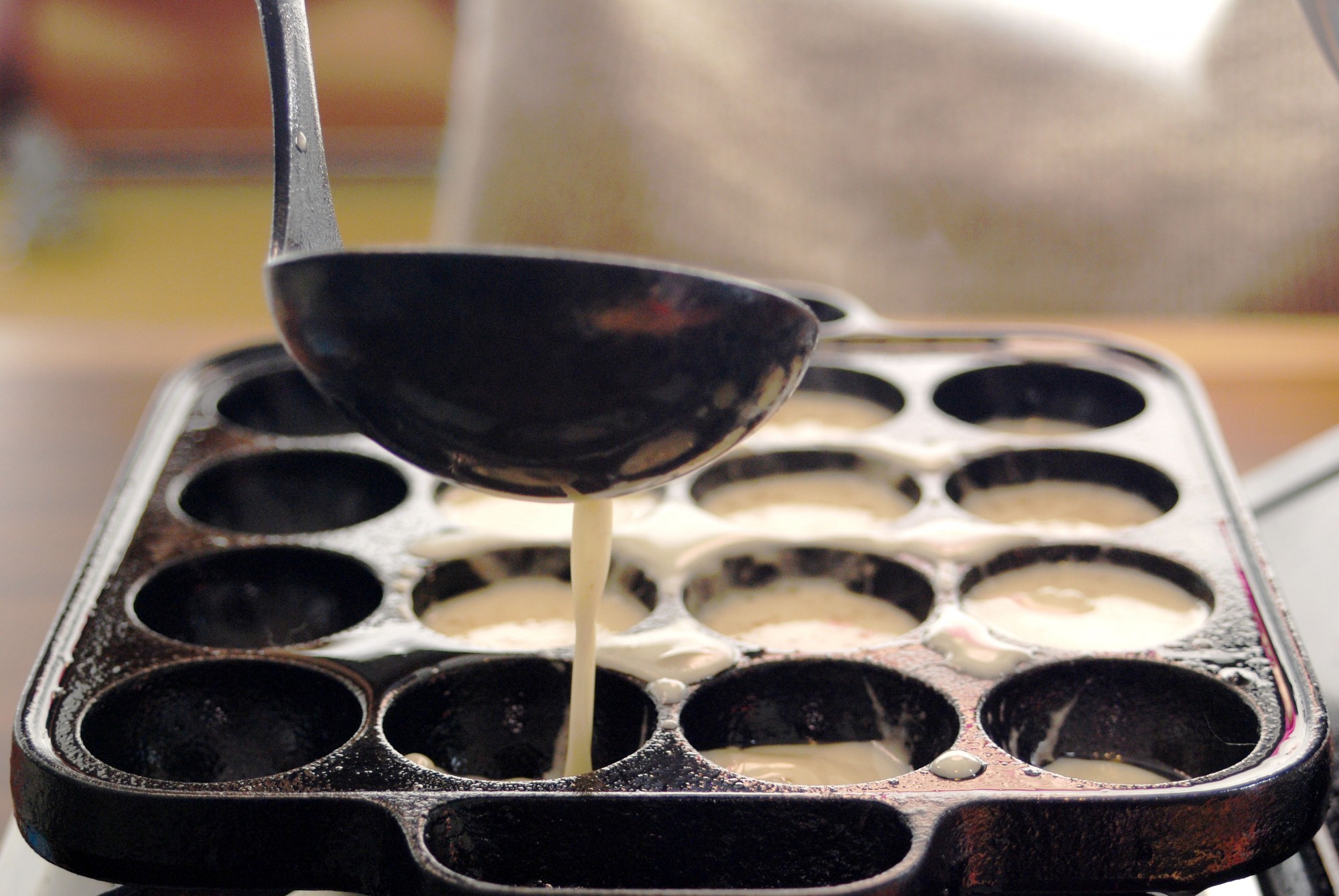 それではたこ焼きを作る手順をご紹介します。今回使用するたこ焼き器は、鋳物のずっしりとしたものです。蓄熱性が高いため、おいしいたこ焼きが焼けます。