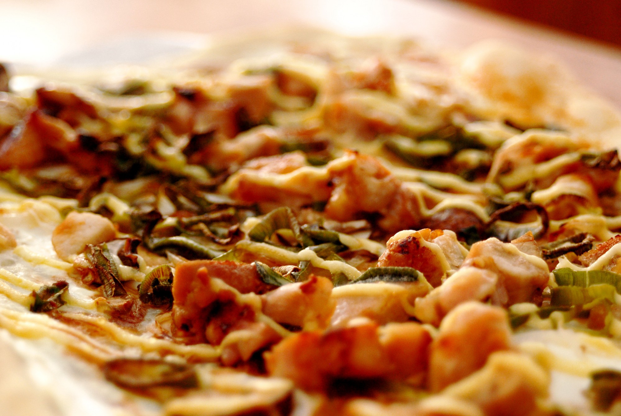 一見するとピザとよく似ているのですが、ピザとの違いは「生地を発酵させない」ことと、ピザソースではなくフロマージュブランというチーズを用いること。生地はピザ生地のようにもっちりした食感ではなく、パリパリしているのが特徴です。
