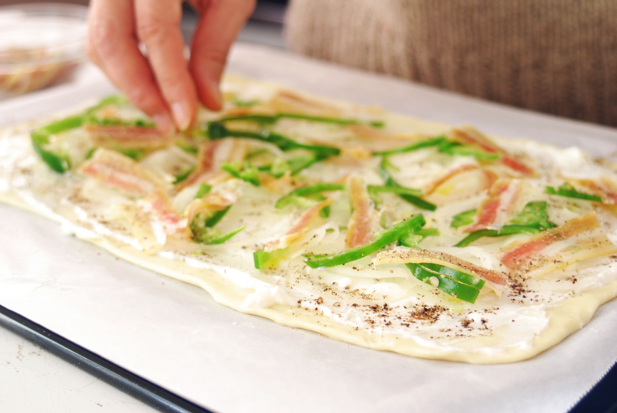 もっともオーソドックスな本場のタルト・フランベは、具材にベーコンと玉ねぎを使います。フロマージュブランを塗ってたっぷりの玉ねぎを乗せた生地は、クリーミーなのにさっぱりしていておやつにぴったり。