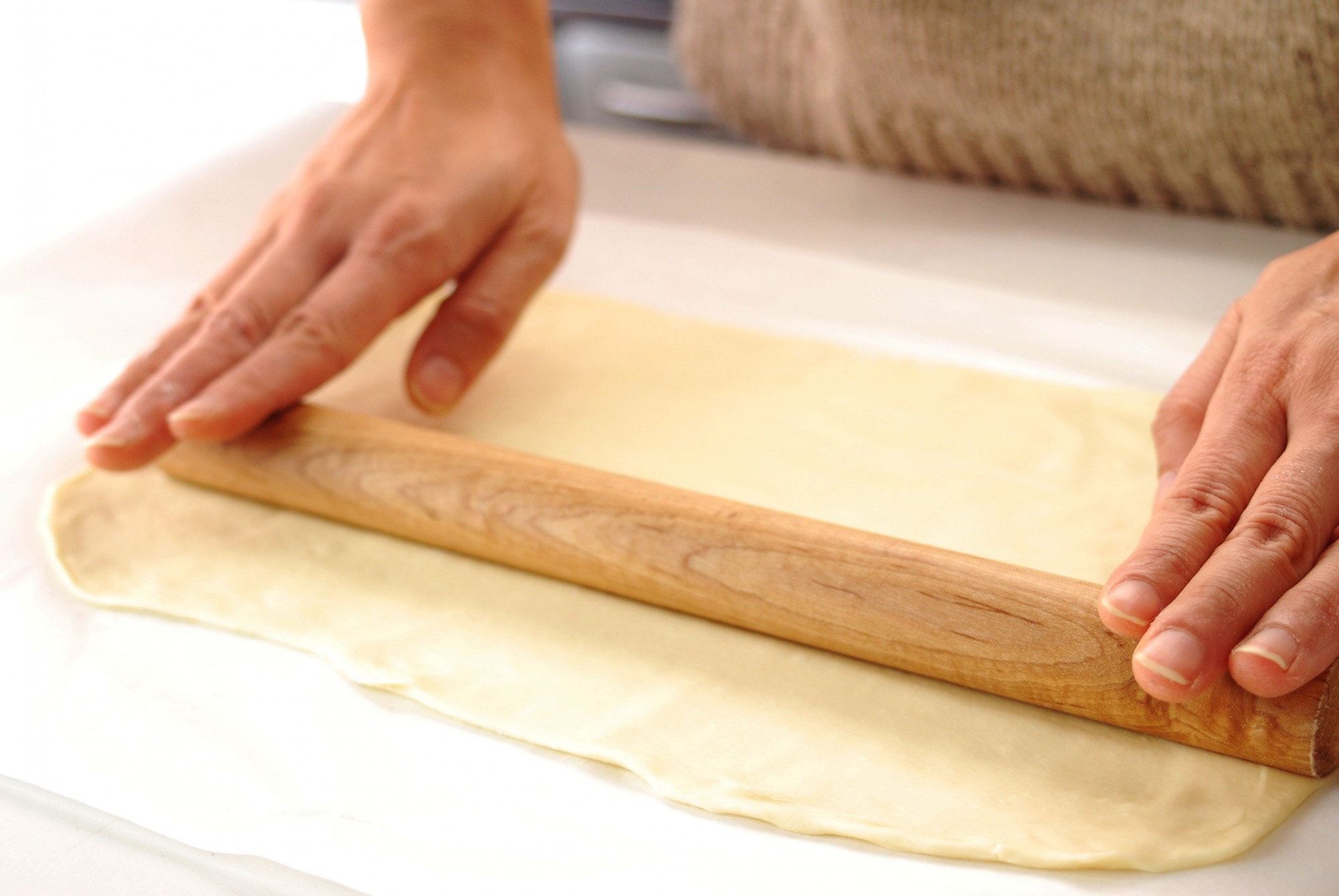 15~30分ほど生地を休ませたら、いよいよ伸ばしていきます。麺棒を使って伸ばしましょう。形は自由でいいですが、タルト・フランベは四角く伸ばすのが一般的です。もちろんピザのように円形に伸ばしたものもあります。ご自由な形で試してみてください。