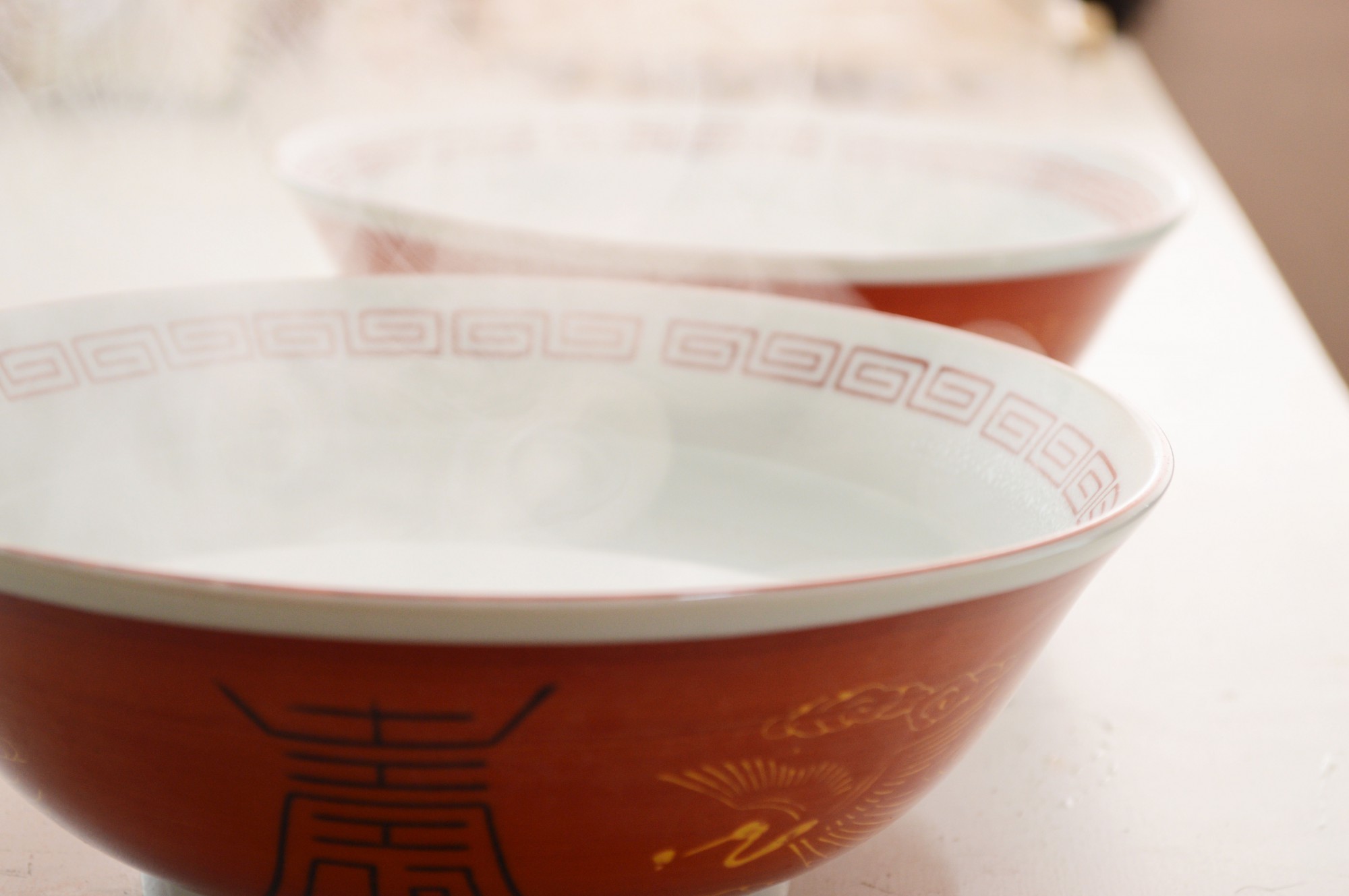 麺を茹でている間に、沸かしたお湯の一部を使って器を温めておきましょう。ささいなことですが、この一手間で仕上がりが大きく変わります。特にガラス製の器は冷たいので、スープを注いだ瞬間から麺もスープもどんどん冷めてしまいます。