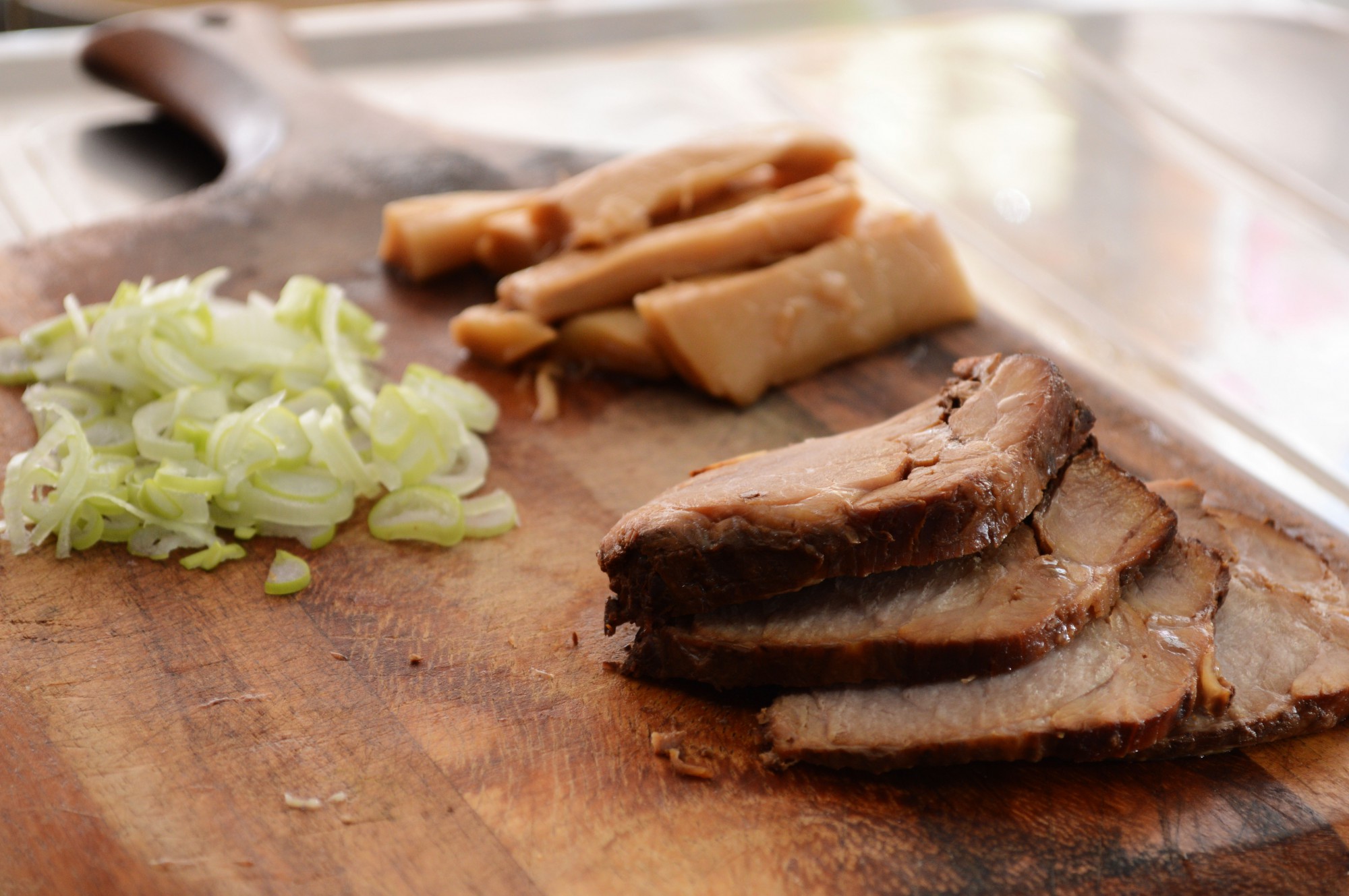 購入した叉焼を厚めのスライスにし、長ねぎも小口切りにしておきましょう。海苔も食べやすいサイズにカットして、トッピングの用意をしておきます。