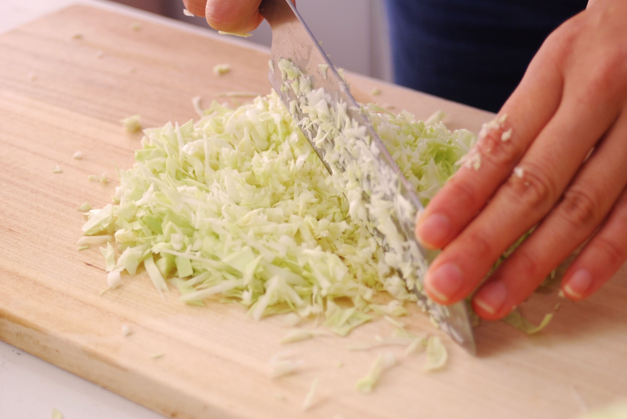 キャベツとニラをみじん切りにします。細かくみじん切りにすればするほど歯触りが滑らかになります。お子さんが小さかったり、歯の弱いお年寄りがご家族にいたりする場合は、具材をできるだけ細かくした方が食べやすいでしょう。