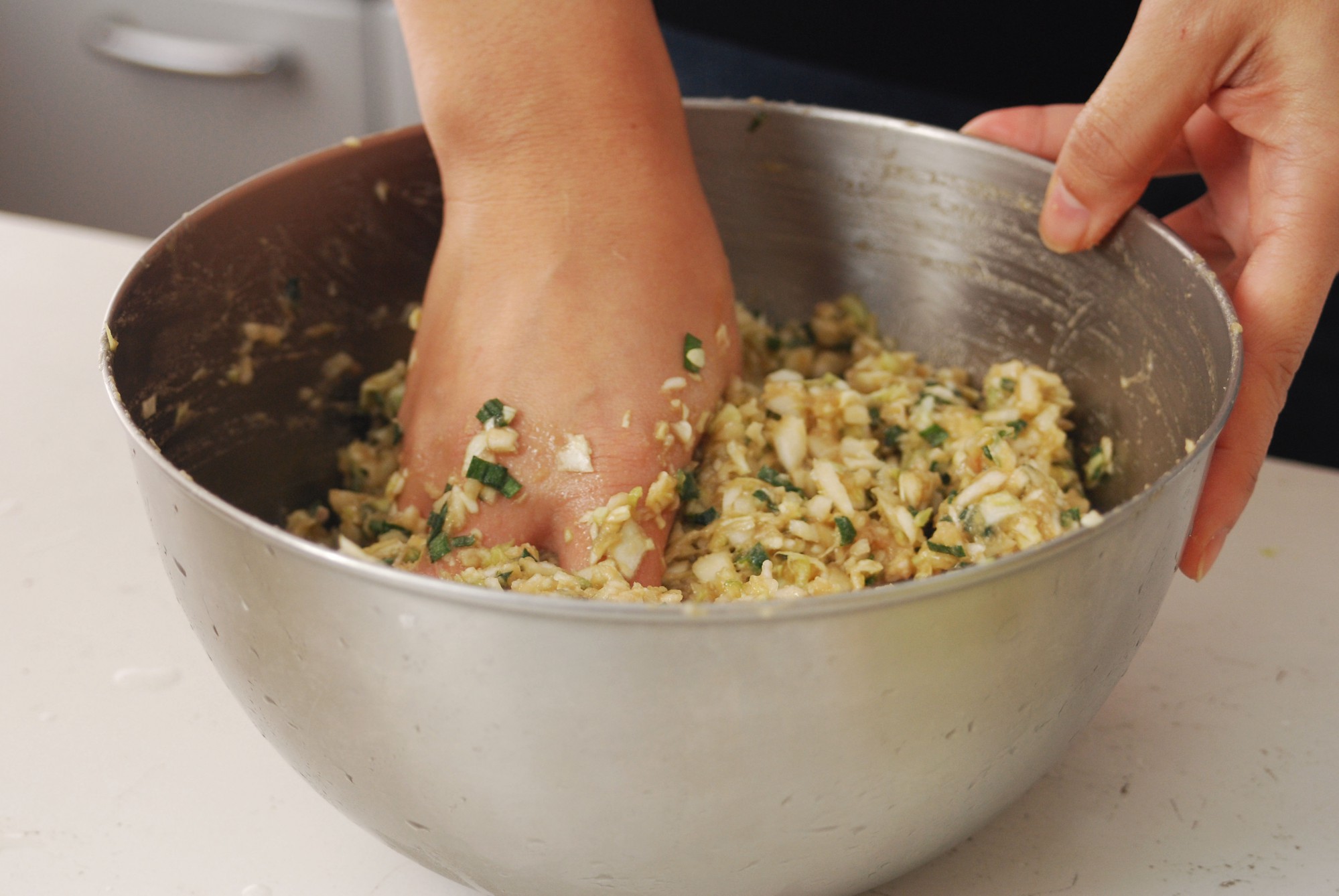 野菜をカットしたら、餃子の皮以外の材料をすべてボウルに入れてよく混ぜます。練るようにして混ぜるのがポイントです。