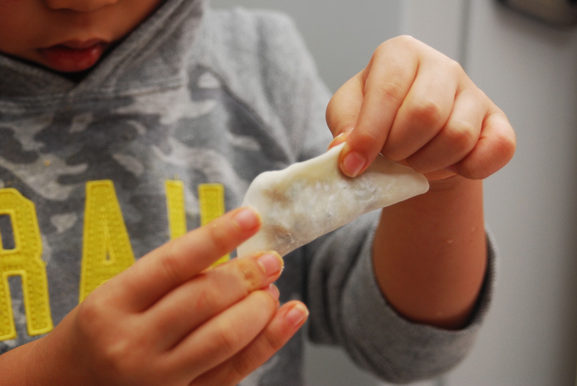 餃子でよく見る幾重にも折り込まれたヒダヒダを作るのは、どうやら子どもの未発達な手先では難しい様子。