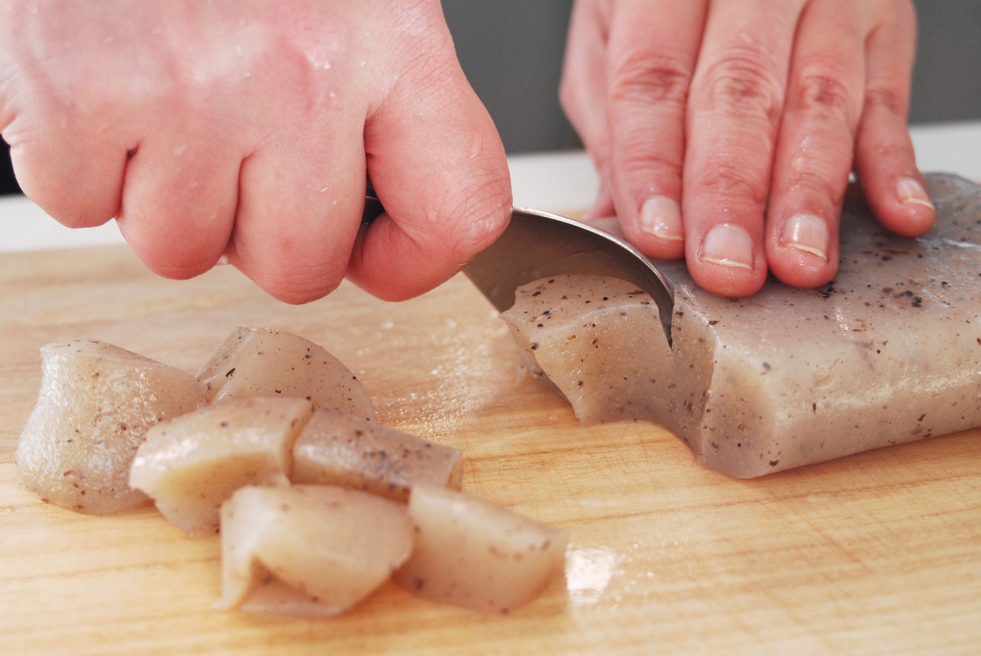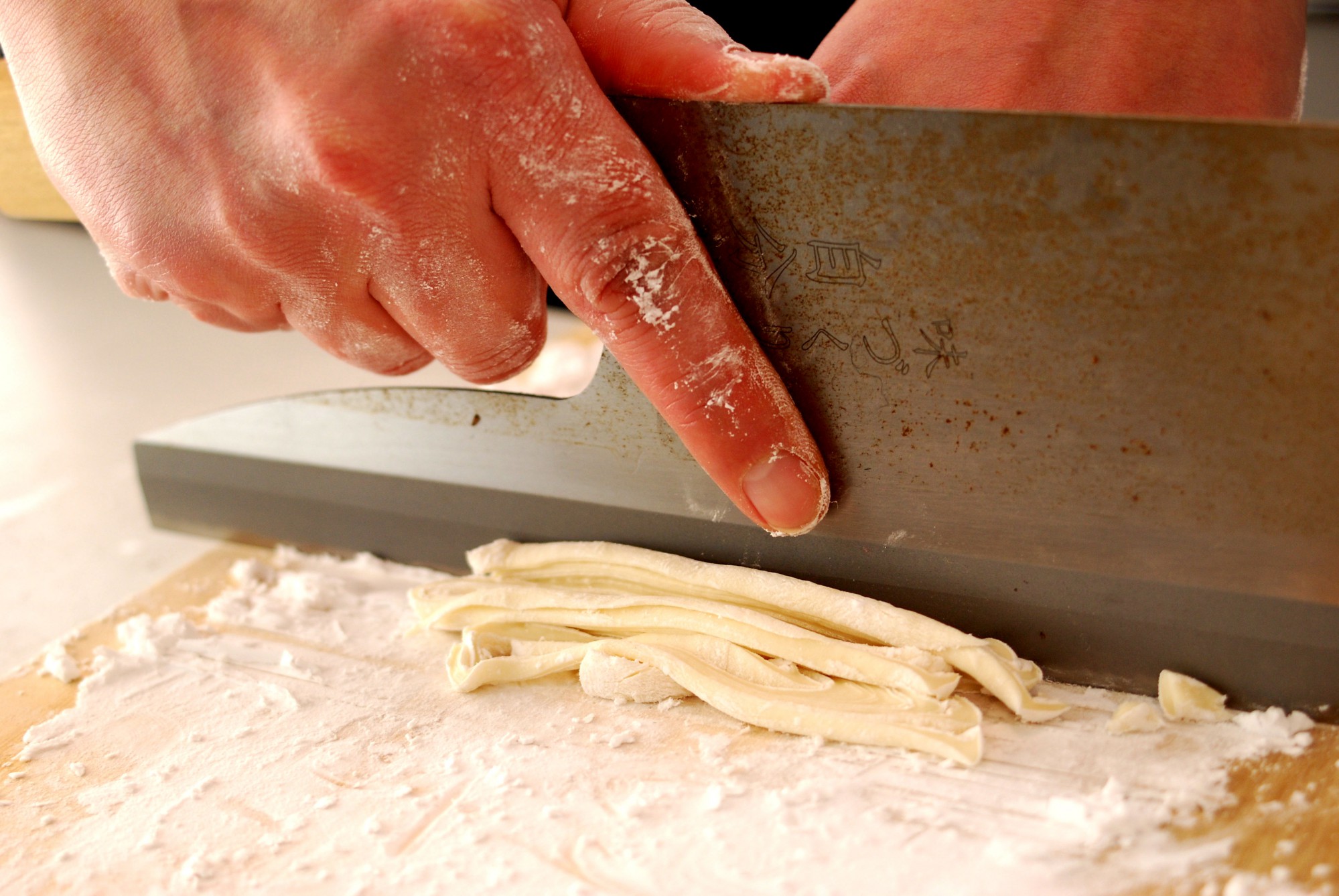 生地を等間隔で切って麺にします。一般的な包丁で大丈夫です。