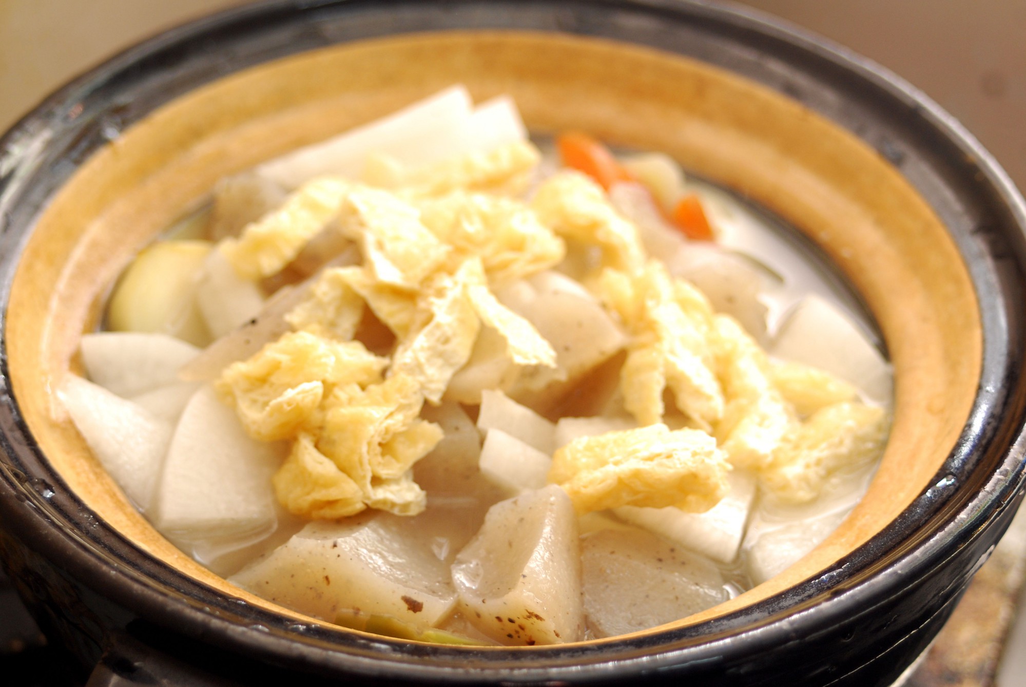 生地を休ませている間にけんちん汁の様子を見てみましょう。さといもが中まで柔らかくなっているようなら、火を消して味噌を溶き味を調えてください。