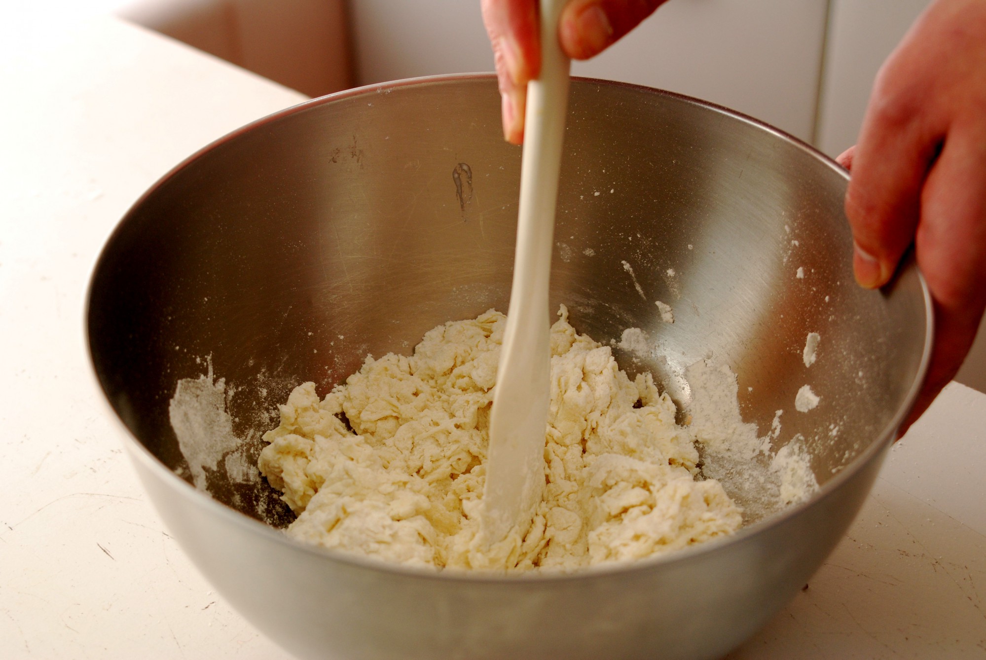 ボウルに粉を入れたら、水を少しずつ足しながら混ぜていきます。3回にわけながら全体に水が行き渡るようよく混ぜましょう。この時点ではまだ粉を練ってはいけません。