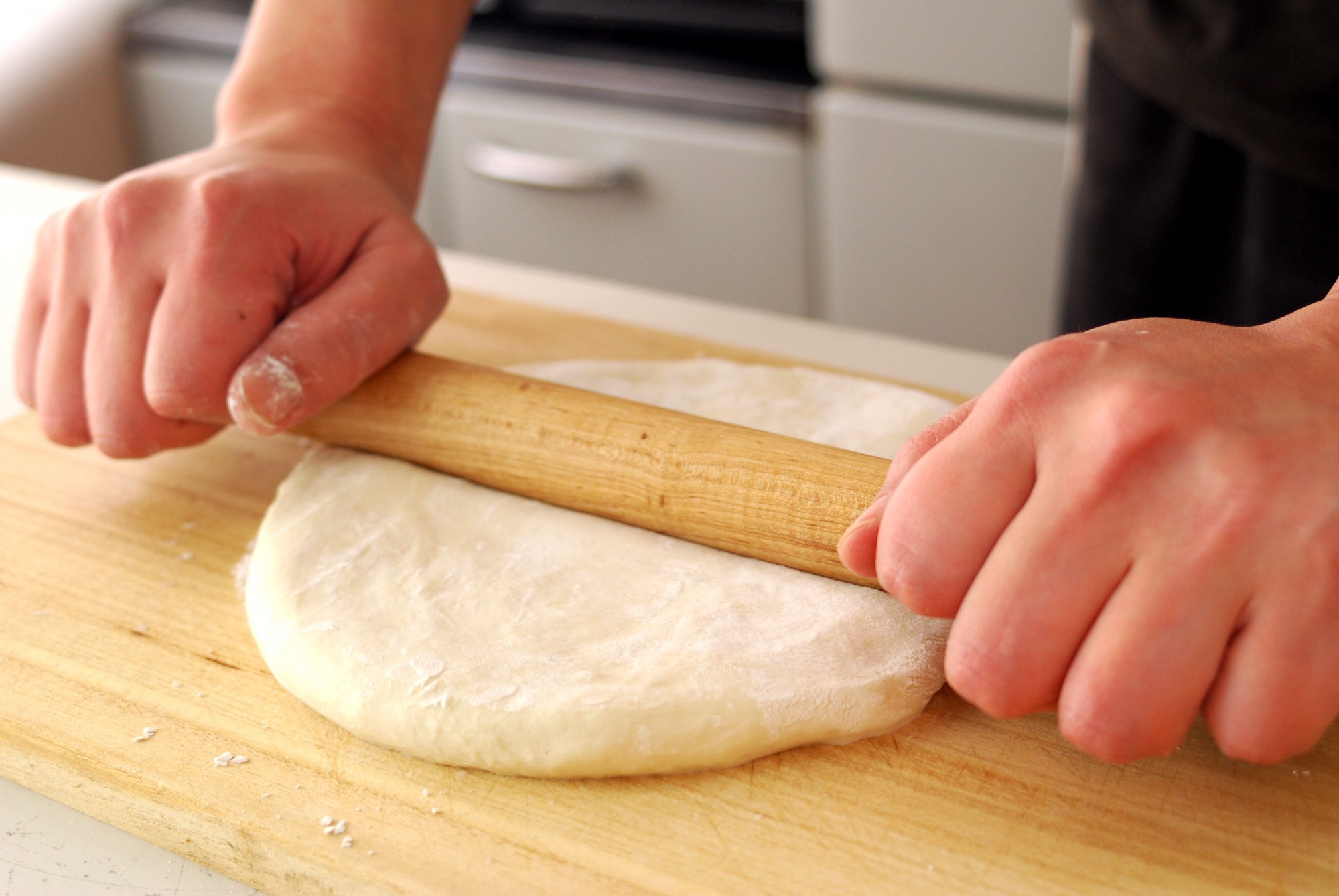 生地を休ませたら麺棒で伸ばしていきます。生地や作業台、まな板に打ち粉を振って、生地がくっつかないようにしましょう。