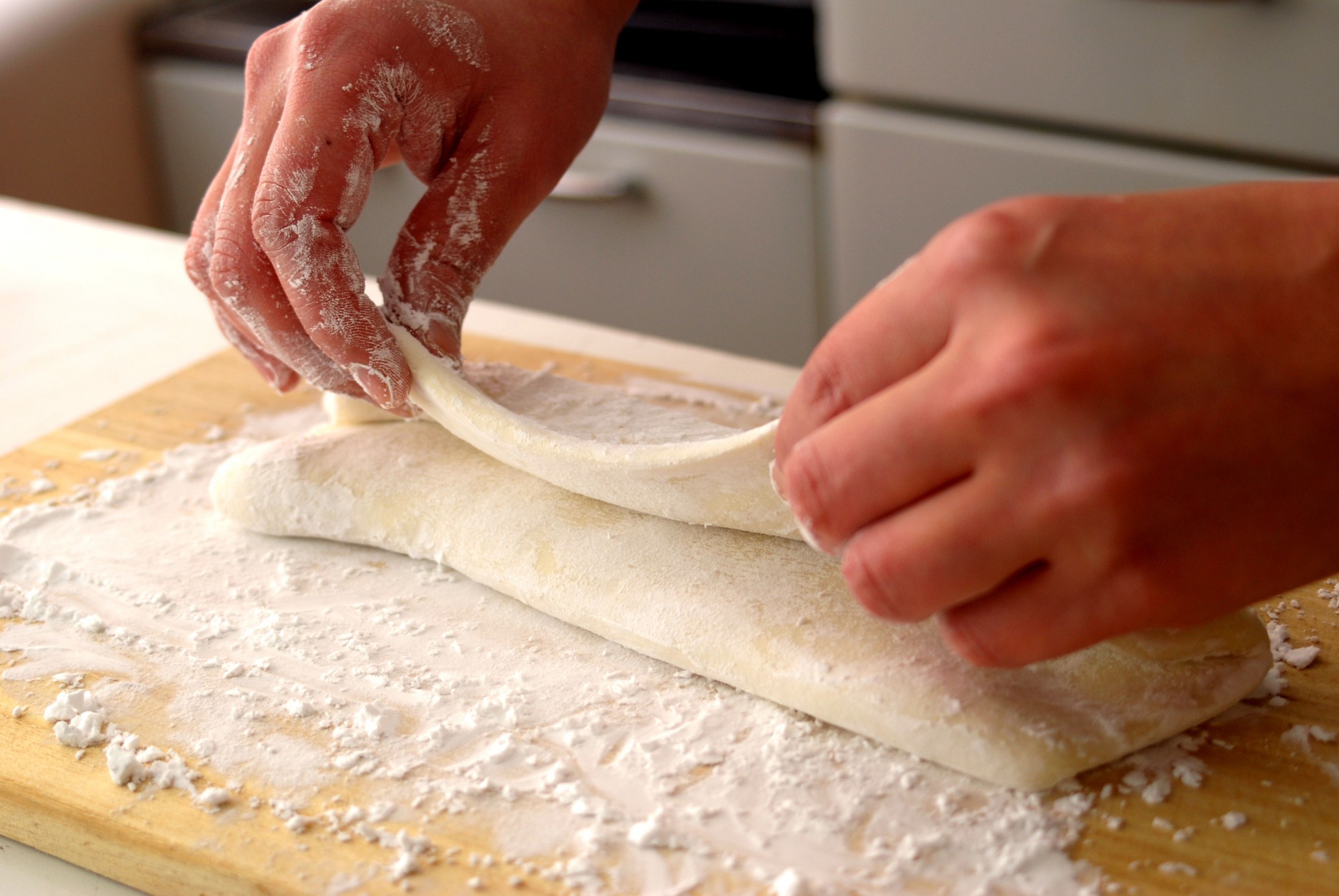 生地をたたむことで切りやすくなります。また、このときに打ち粉を惜しむと生地同士がくっついて取り返しがつかなくなるので、惜しまずたっぷり打ち粉を振りましょう。