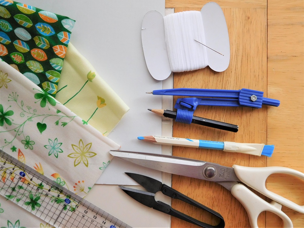 厚紙やコンパスはハギレを円形にカットするために使います。コンパスがなければ、直径7cm前後のコップや筒などを利用すれば大丈夫です。