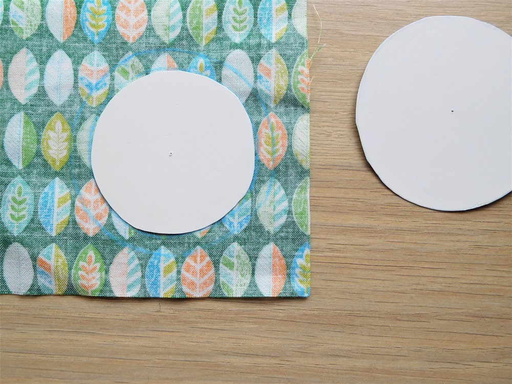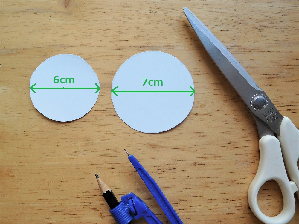 大きさはそれぞれ直径7cmと直径6cmです。好みでサイズを変更してもかまいません。その場合、2種類の円の直径に1cmの差を持たせると、0.5mmの縫い代が確保できます。