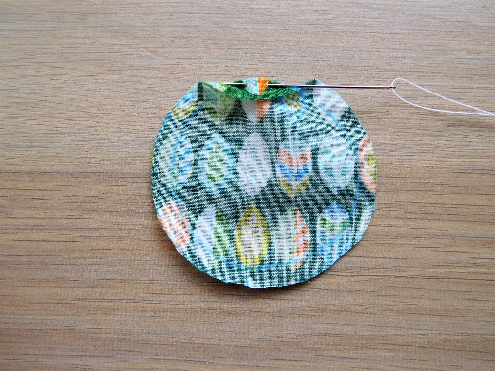 元の玉結びのところまで縫えたら、糸をゆっくり引っ張って布を縮めます。円の形を整えながら、あいだの糸が見えないようにしましょう。