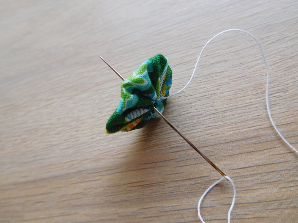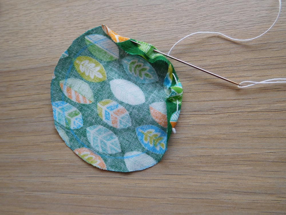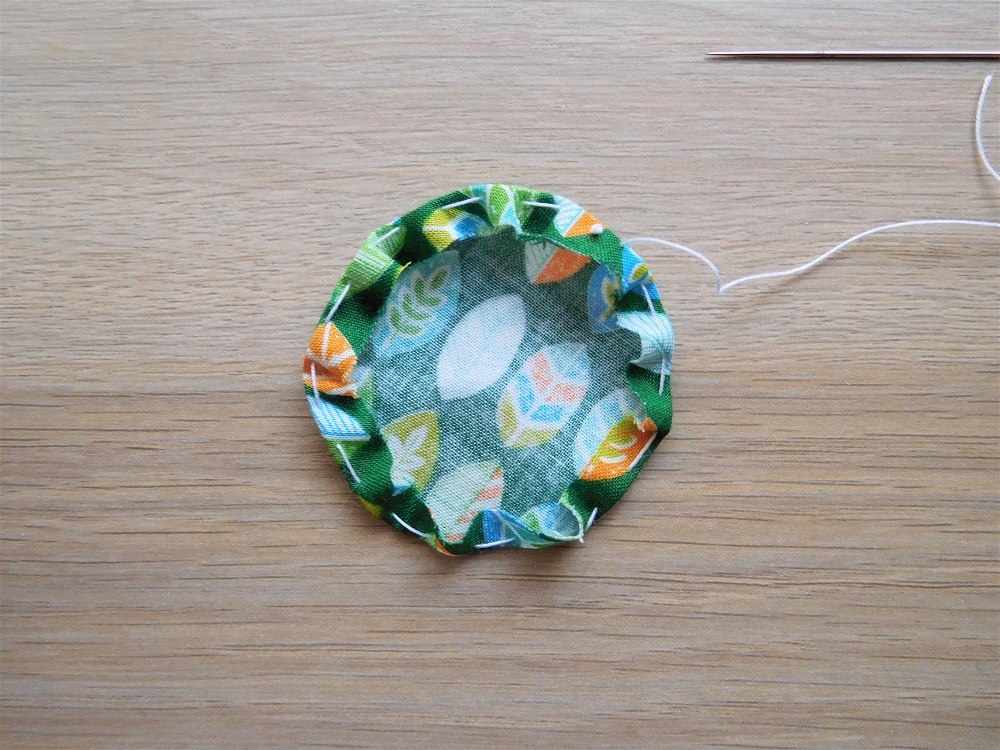 縫い目を細かくするとギャザーの数が増えすぎて逆に布が中心に集まりにくくなり、穴が大きくなってしまいます。大きめの縫い目を意識してくださいね。