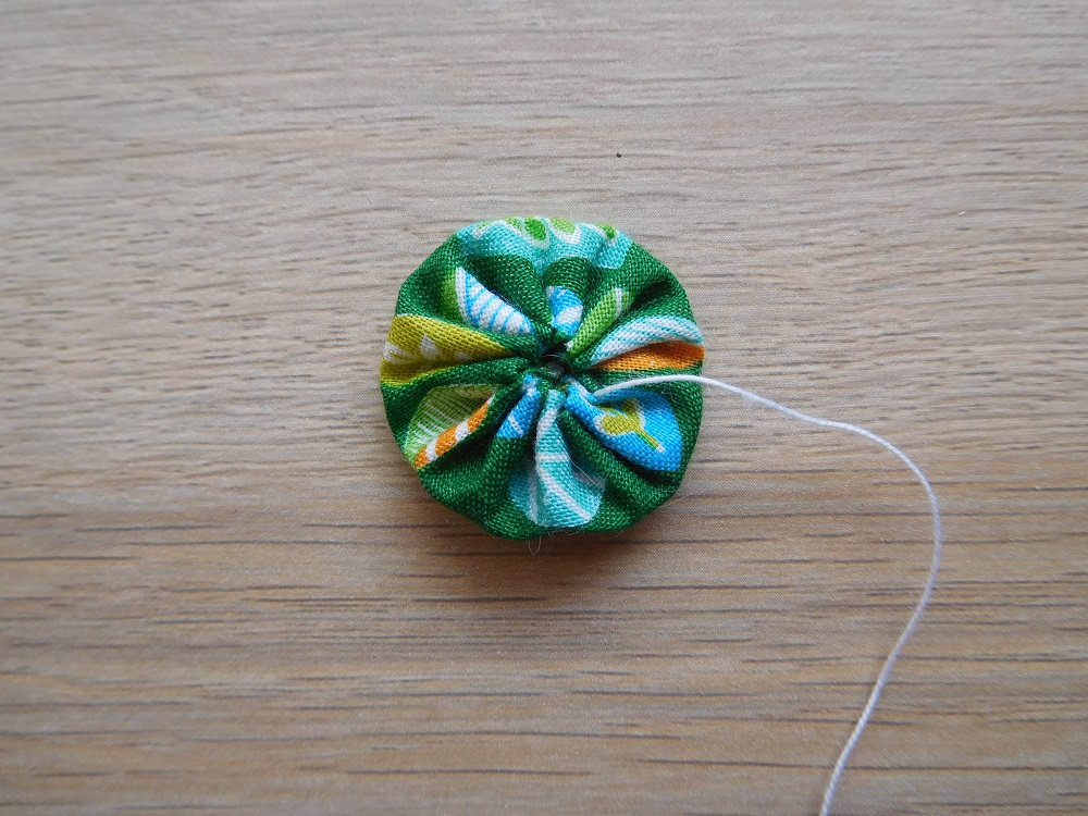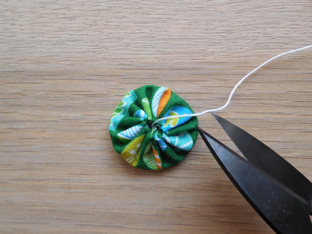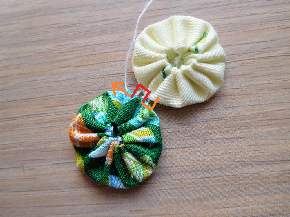 ここの縫い目は小さめにし、コの字で縫えば糸が見えません。片方のヨーヨーキルトを一針すくったら、次にもう片方を一針、というふうに交互に進めていきます。縫えたら針をヨーヨーキルトの中心近くに出して玉止めをします。もう一度内側から外側に針を通して、玉止めをギャザーのなかに隠すようにしましょう。
