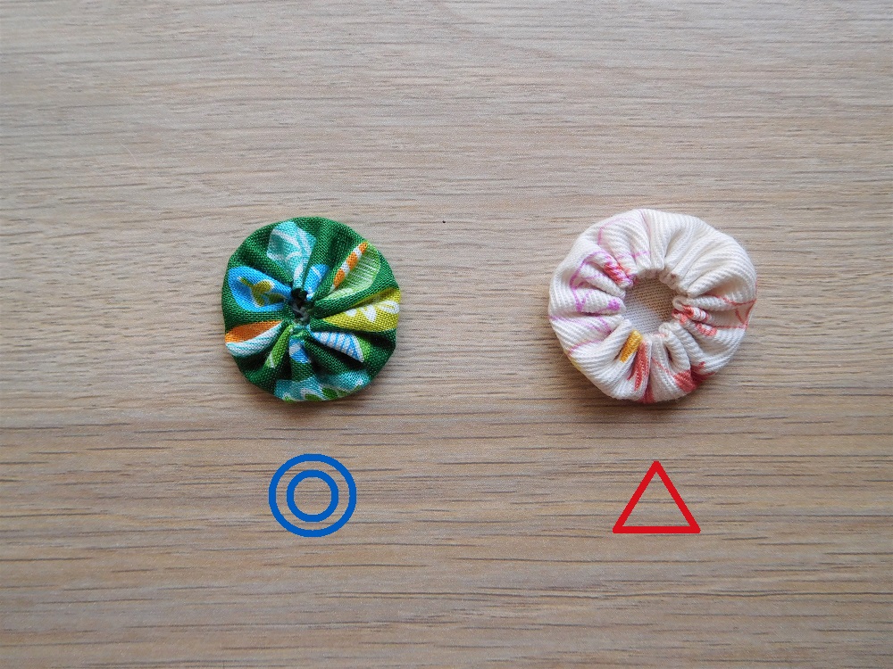 一般的なキルトは、表裏の布の間に綿をはさんで厚みを持たせています。ですが、ヨーヨーキルトの場合は1枚の布で表裏の両面を作り、ギャザーを寄せることで厚みが出るため、綿を使用しません。