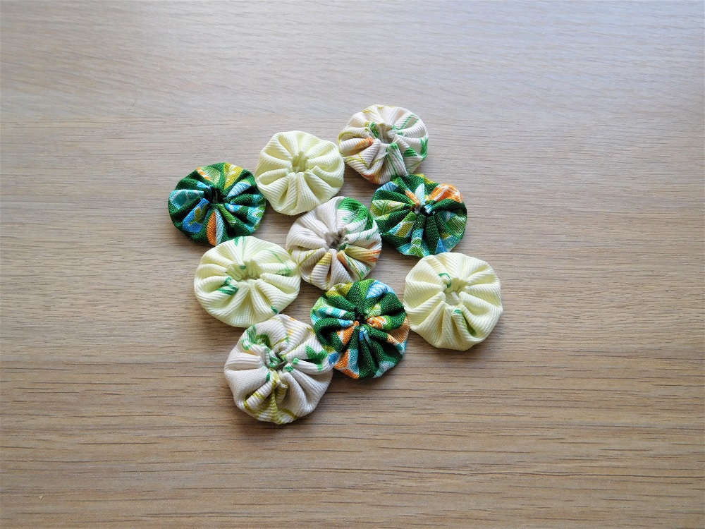 同様の手順でヨーヨーキルトを9つ作れたら、今度はこれをつなげていきましょう。複数の色柄を使う場合は、どんな配置にするのか一旦並べておくのがおすすめです。