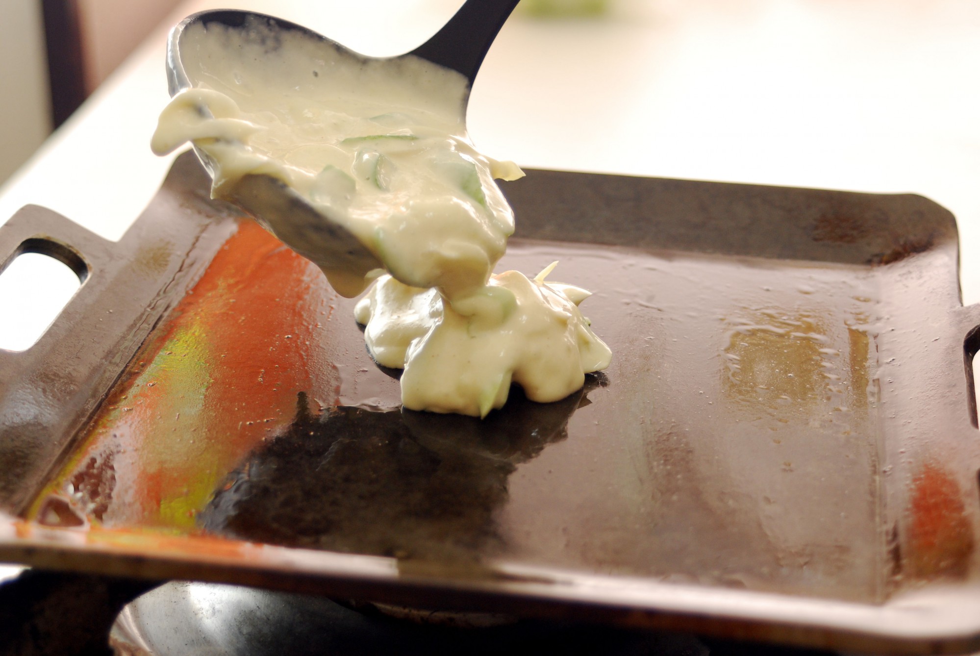 生地をひっくり返すには、鉄板用のコテやフライ返しなどを使うと便利。