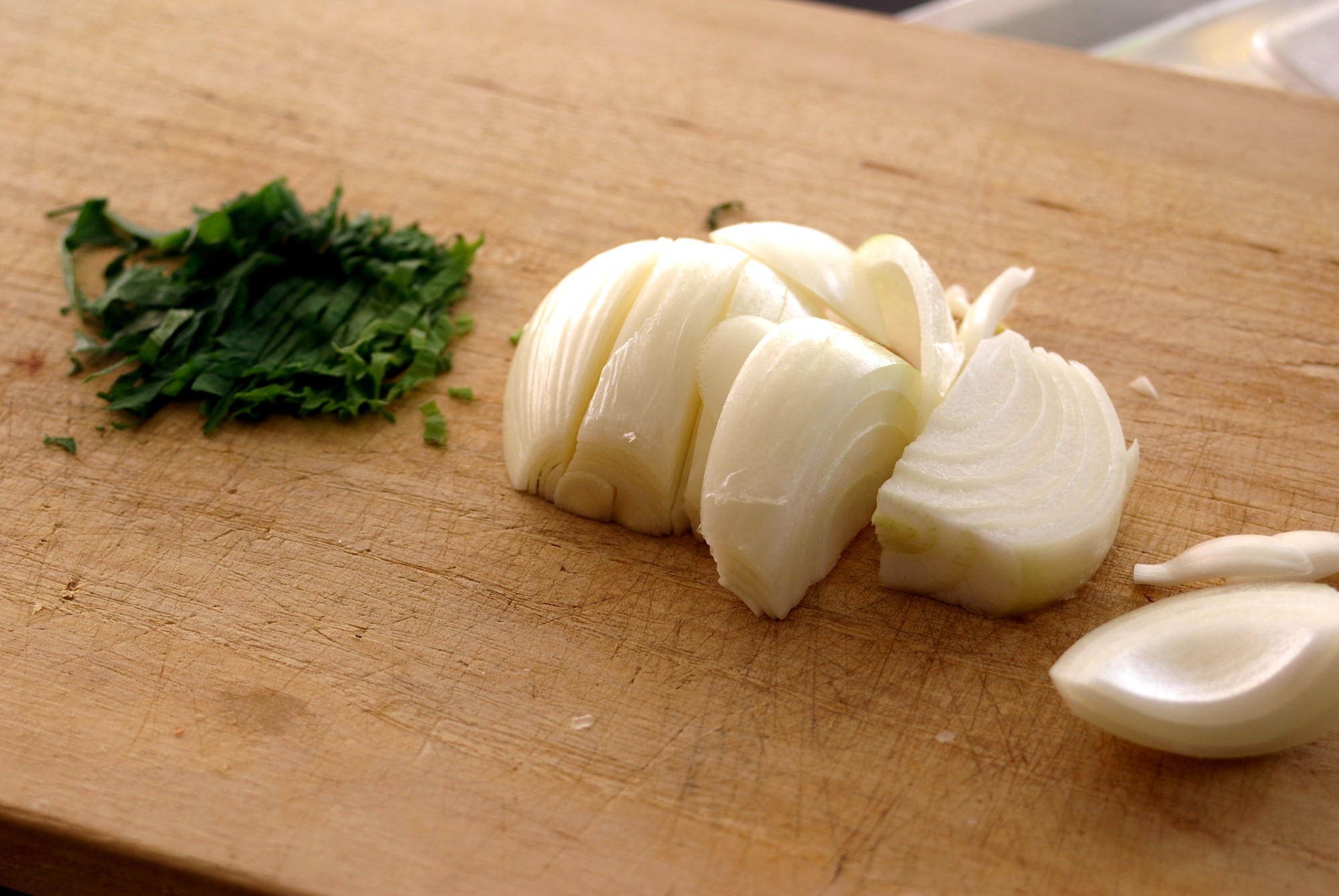 玉ねぎは皮をむいて半月切りにします。大葉は表面を拭いてから千切りにしましょう。