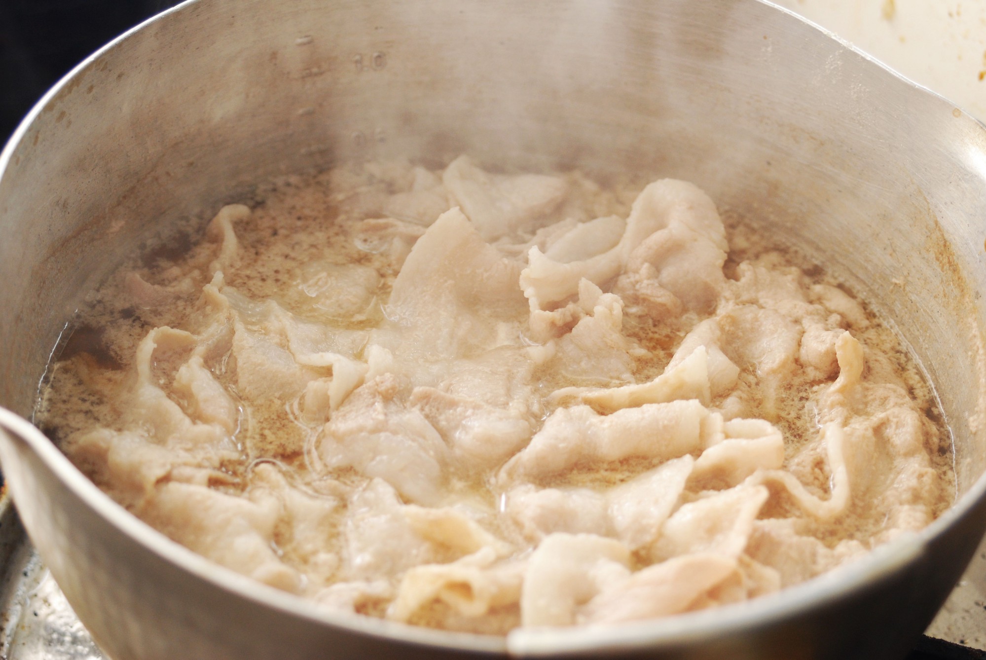 豚肉はあまり煮込むと固くなってしまうので、全体に火が通ったら火からおろして構いません。鍋に残った汁は焦げないように注意しながら煮詰めて、丼にかけるたれとして使いましょう。
