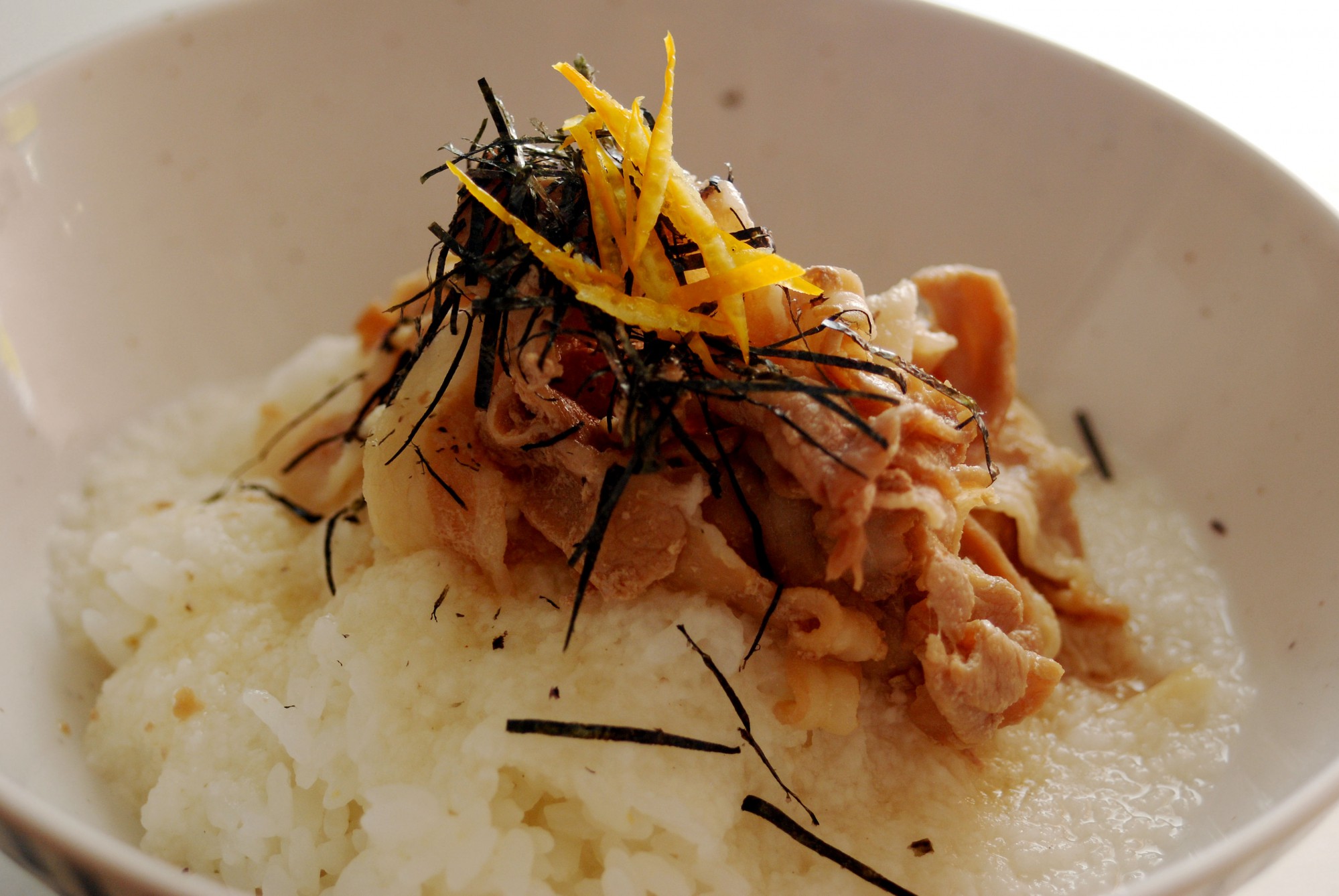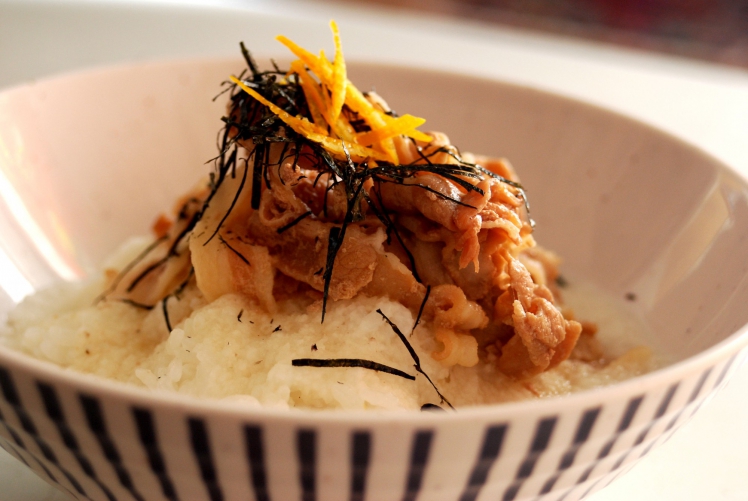 丼に盛りつけたらあつあつご飯の上にすりおろした大和芋をかけ、甘辛く煮た豚バラ肉を乗せるだけ。最後に刻んだゆずの皮と海苔を飾って完成です。