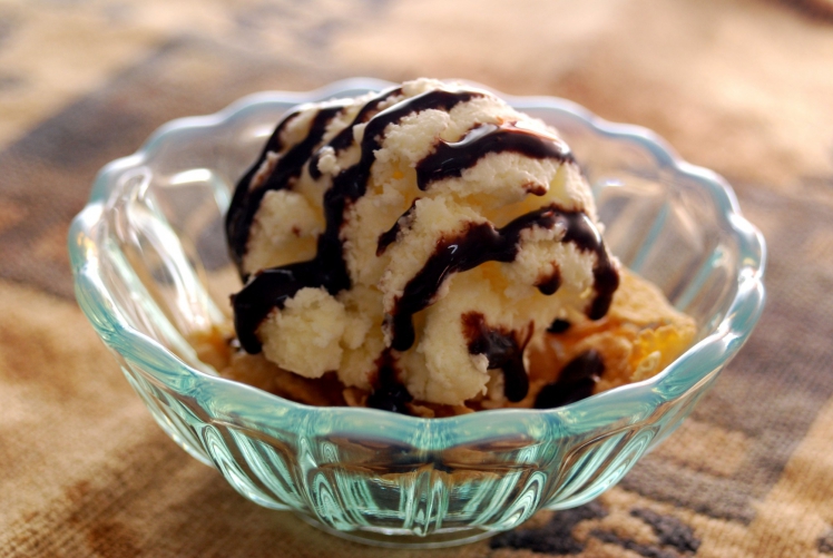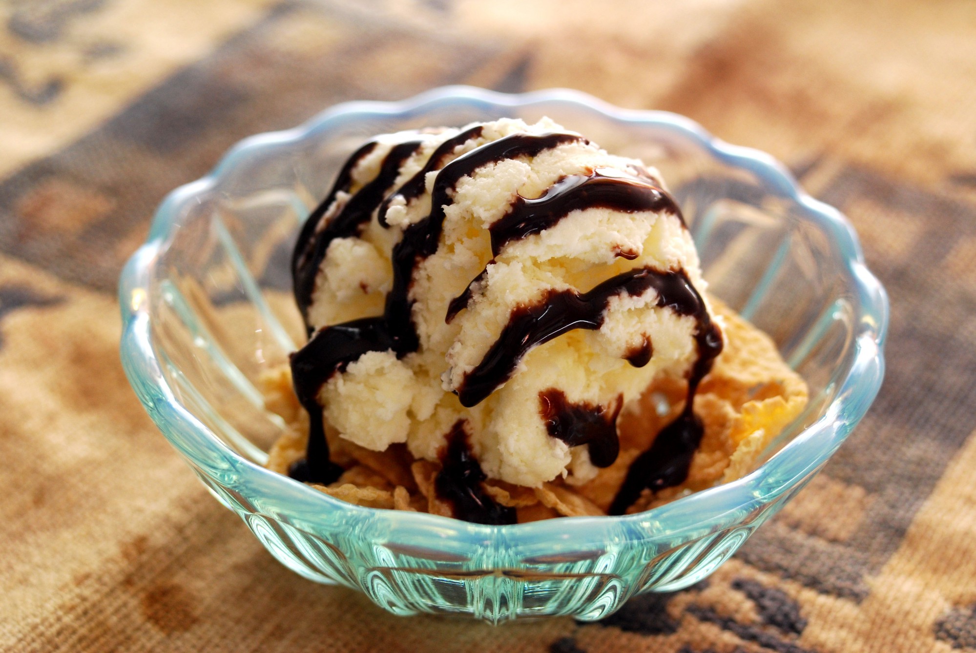 今回はコーンフレークの上に手作りアイスクリームを乗せ、チョコレートソースをかけてみました。溶けてきたアイスがチョコと混ざり、コーンフロストにしみてきたときが最高においしいですね!