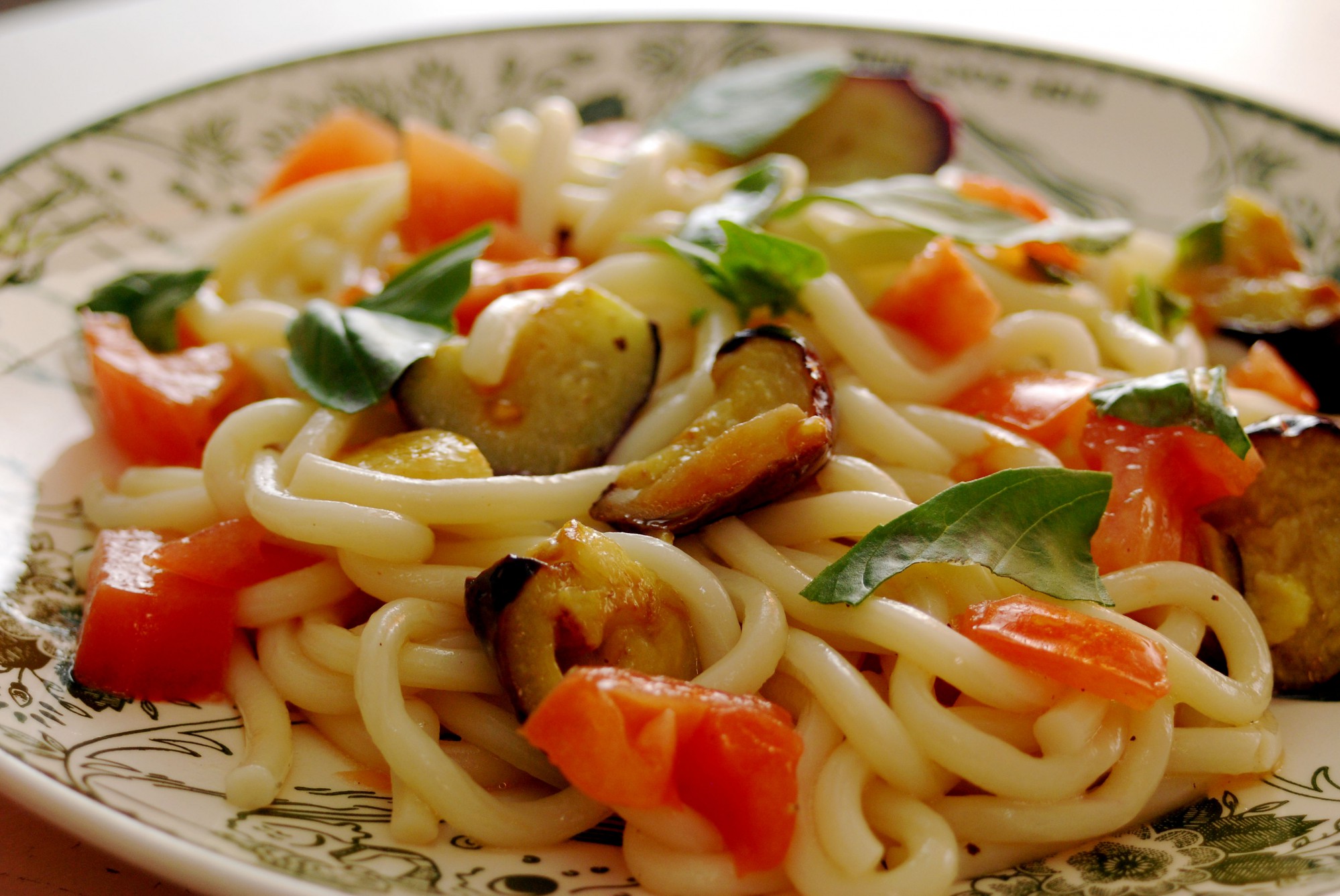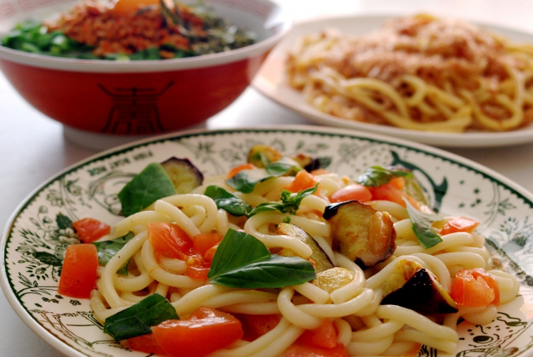 トマトを1cm程度の角切りにしてボウルに入れ、レモン果汁、ちぎったバジル、塩を加えて全体をよく混ぜます。最後に、温めてから水で締めたうどんを加えて混ぜたら完成です。