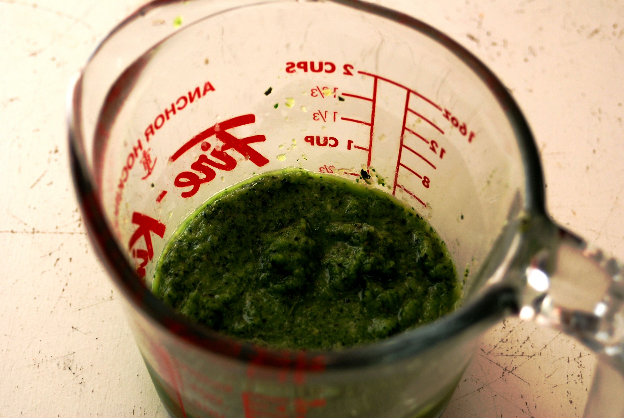 にんにく、しょうが、パセリ、バジル、青唐辛子、梨をあらみじん切りにし、サラダ油(A)と一緒にミキサーにかけて細かくしましょう。パセリがない場合はほうれん草を使っても構いません。あるいはバジルが大量にある場合は、パセリやほうれん草を使わずすべてバジルを使うと、いっそう本場感が強くなります。