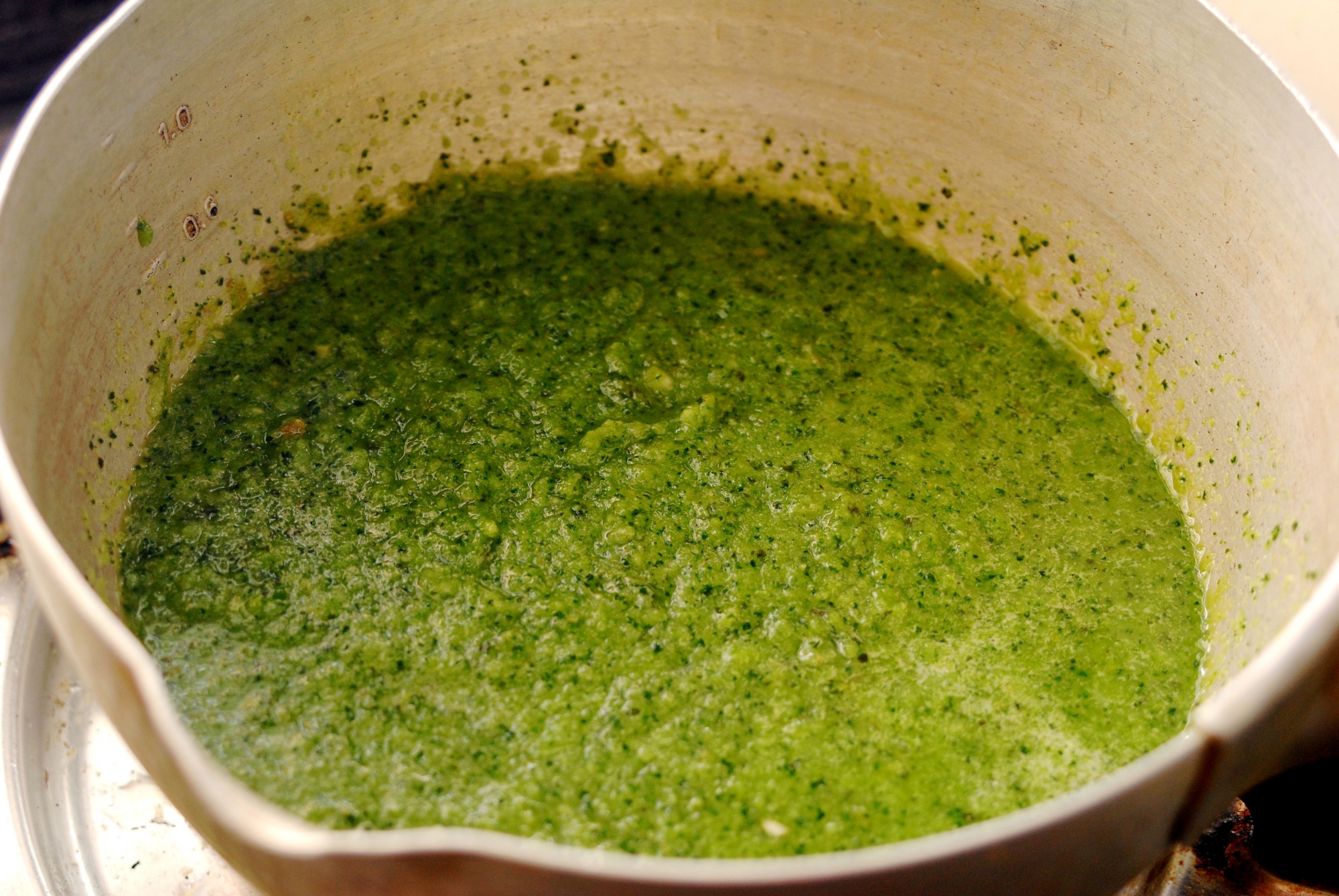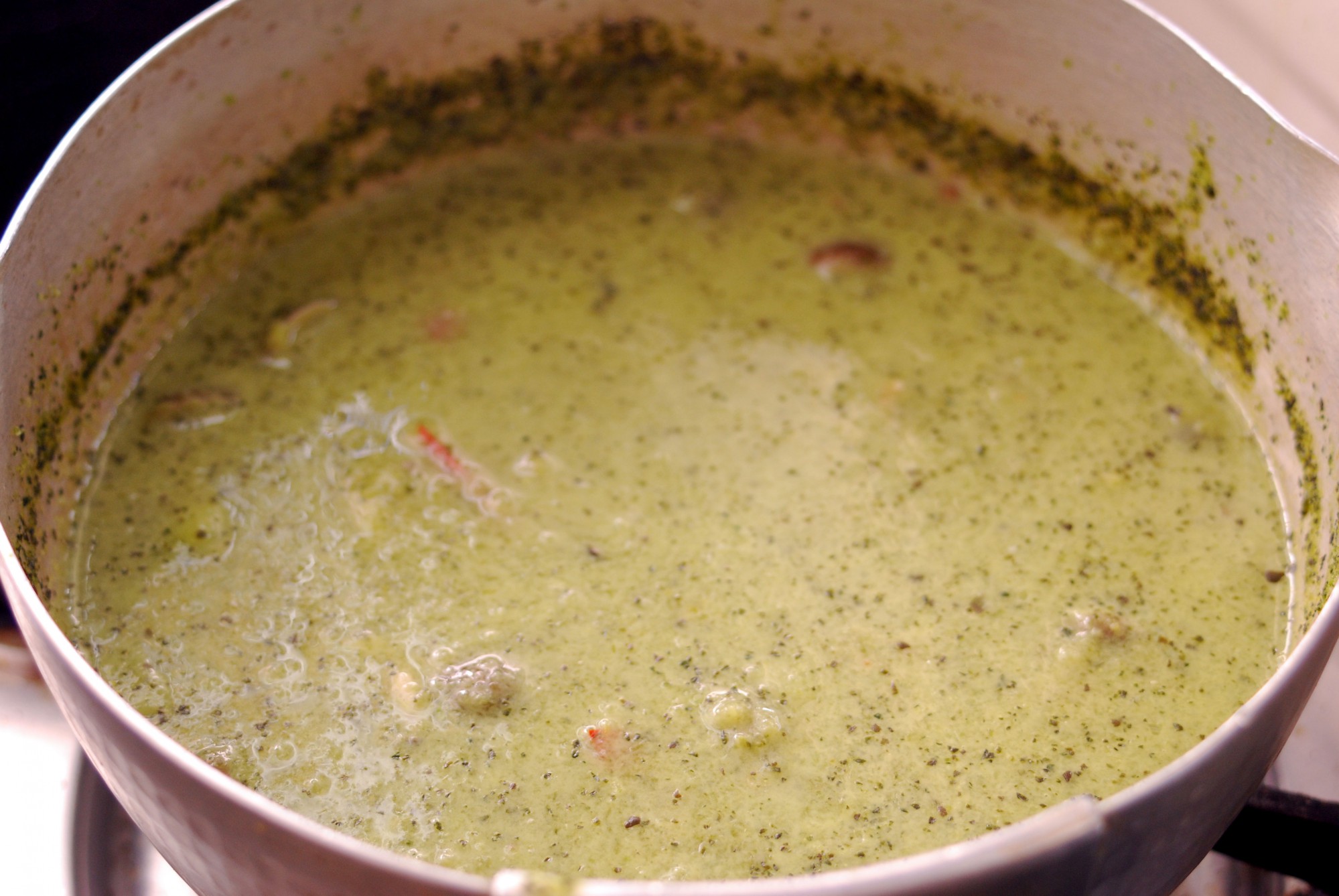 ①で作ったグリーンカレーペーストを鍋に移し、塩を加えて弱火にかけます。強火で沸かすとせっかくの香りが飛んでしまうので、弱火でじっくり加熱するのがポイント。底が焦げないよう、たまに混ぜてあげてください。