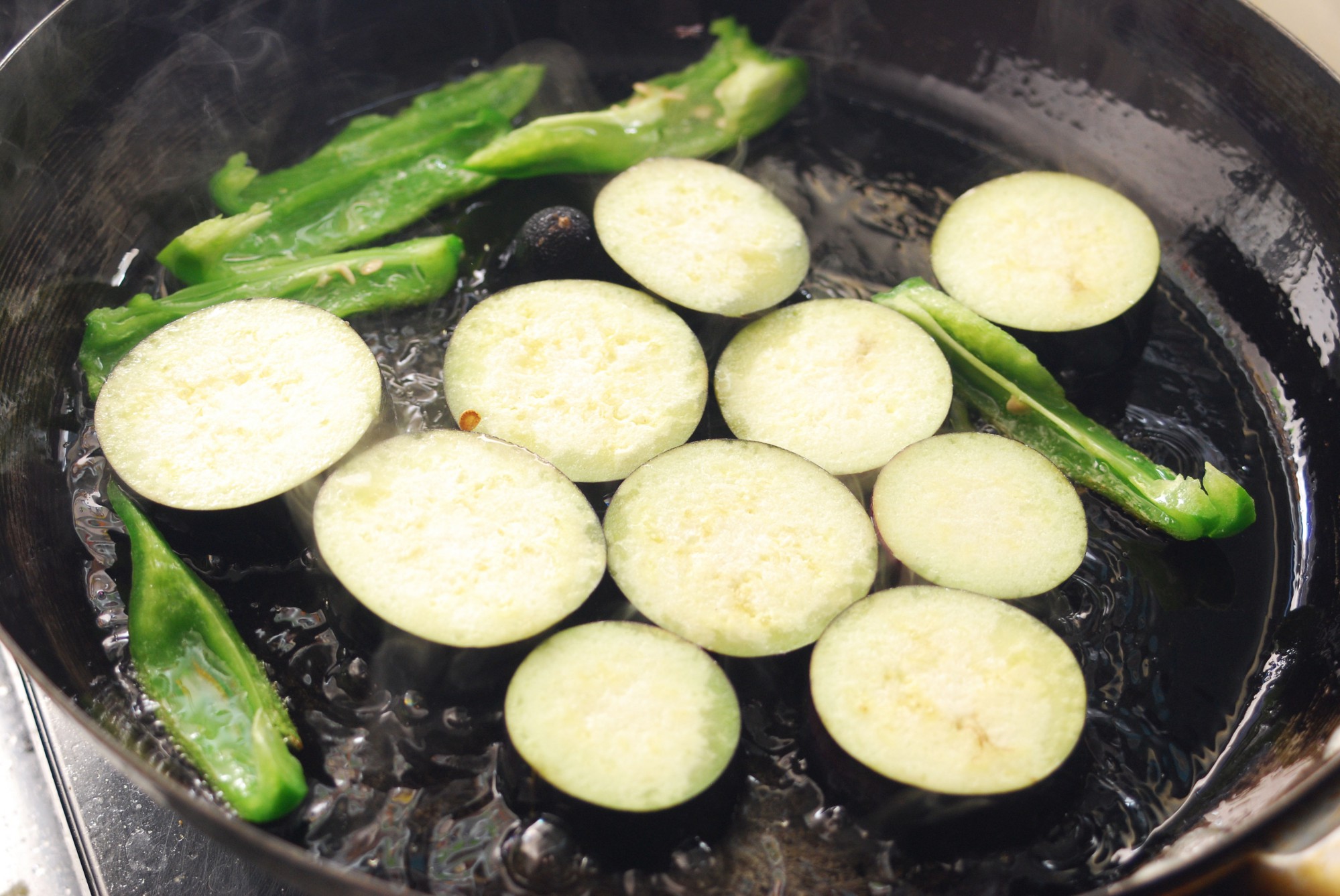 フライパンにサラダ油(B)を引いて加熱したら、幅広の細切りにしたピーマンと、輪切りにしたナスを炒めます。ナスは油との相性がいいので、油をたっぷりと吸わせましょう。