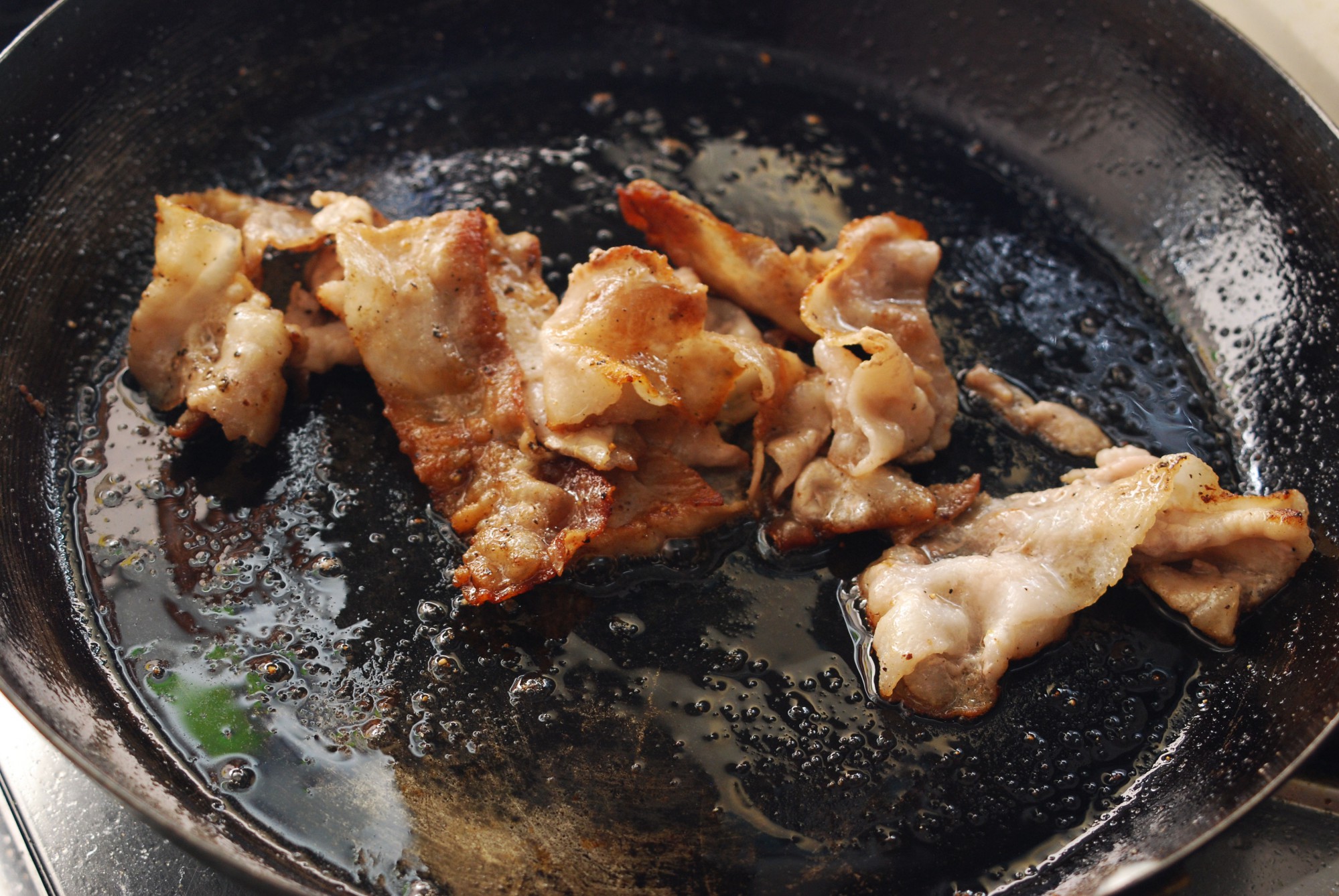 八千代カレーっぽさを演出してくれる豚バラ肉は、④でフライパンに残った油を利用して炒めます。味つけは塩こしょう(分量外)でシンプルに。