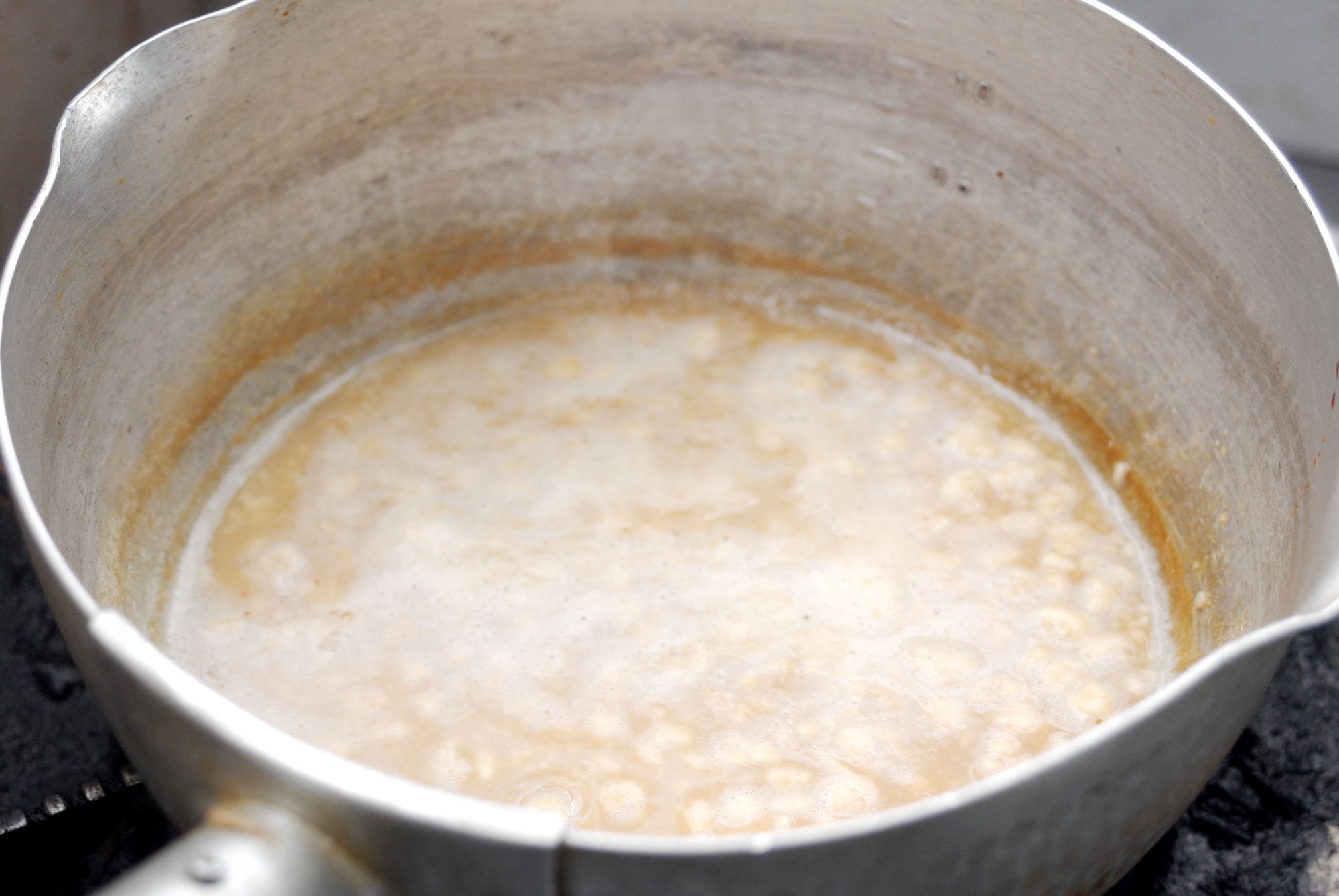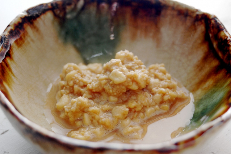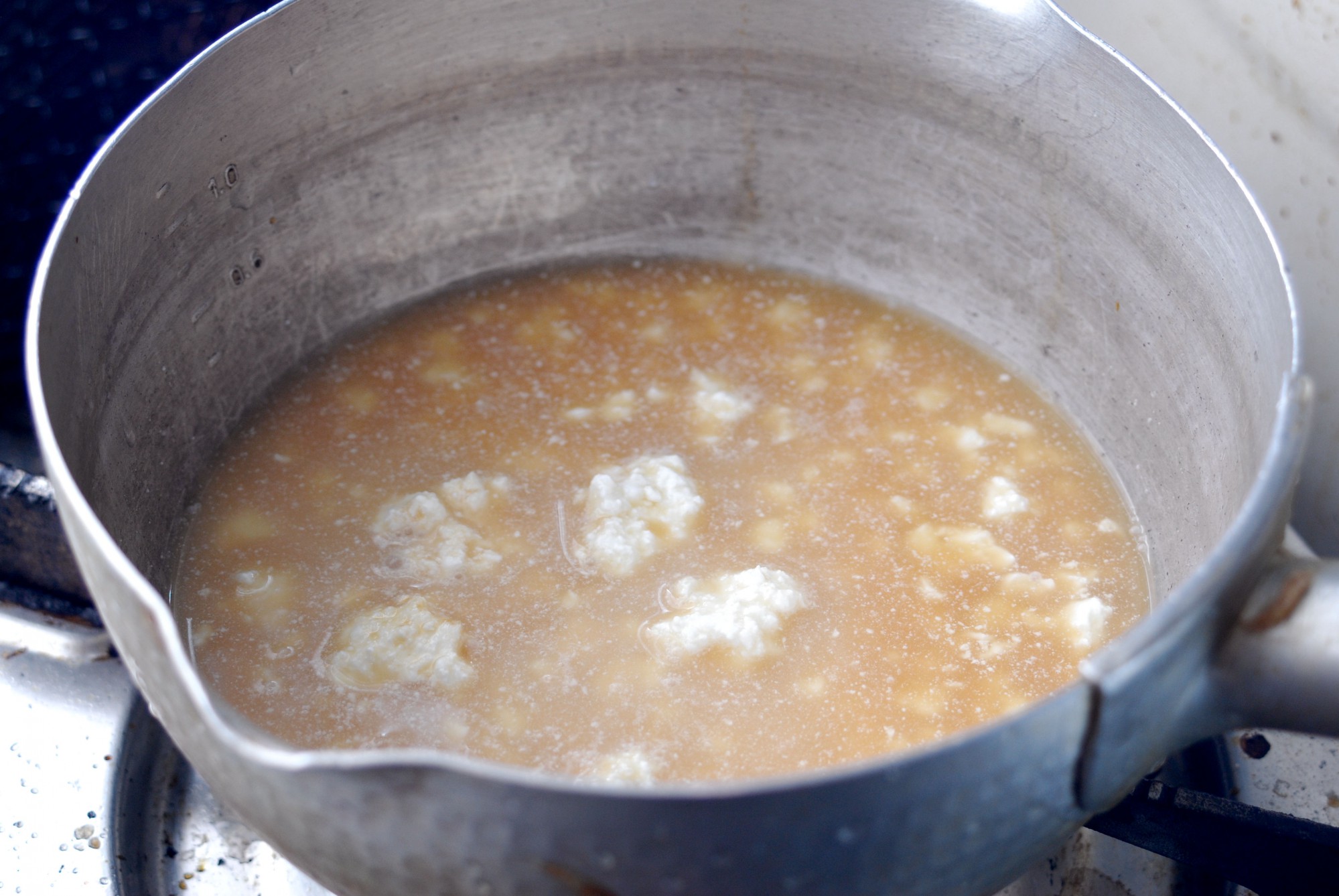 この作業をしばらく続けていくと、次第に初乳のたんぱく質が固まり始め、カッテージチーズのような状態になります。これが初乳豆腐です。
