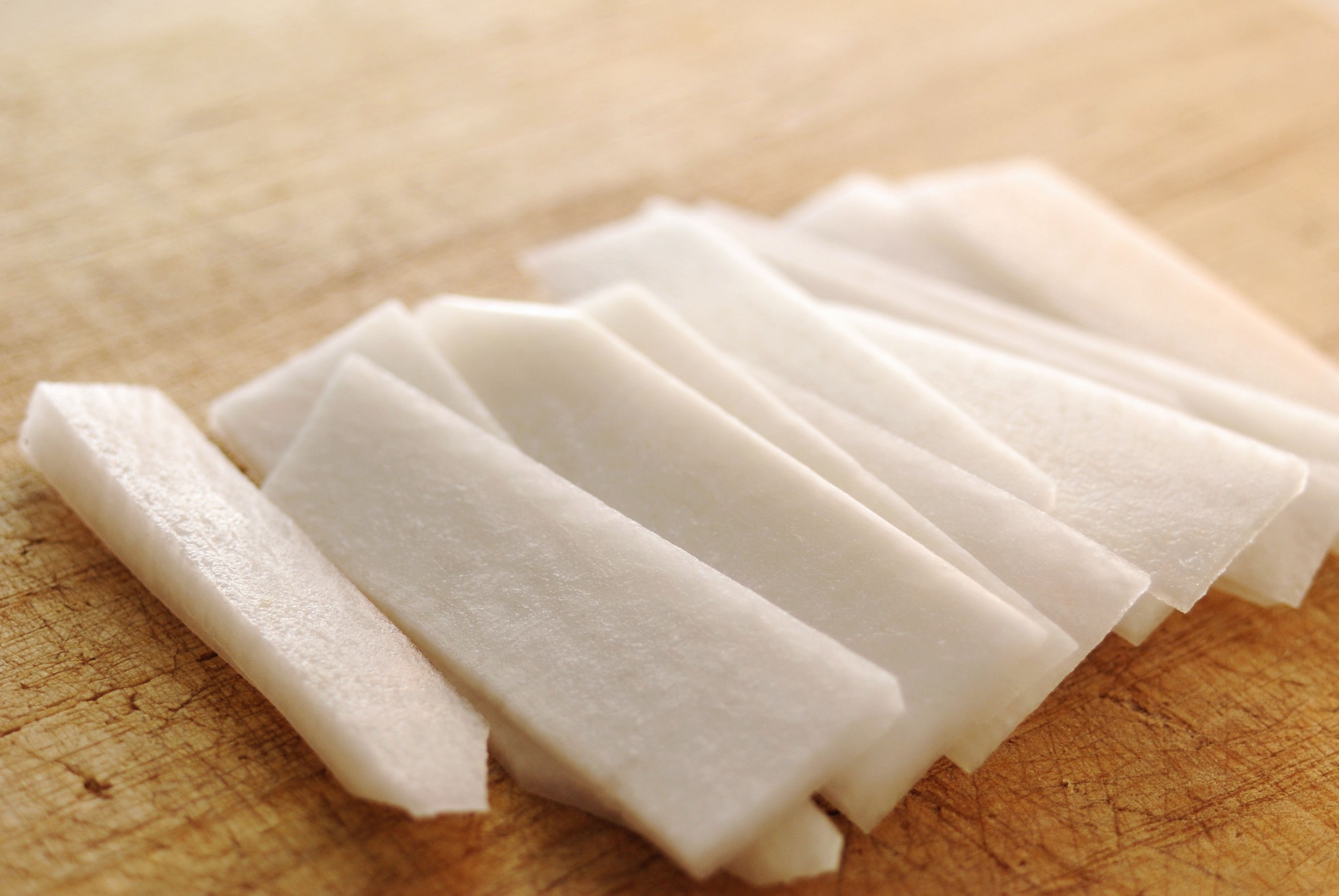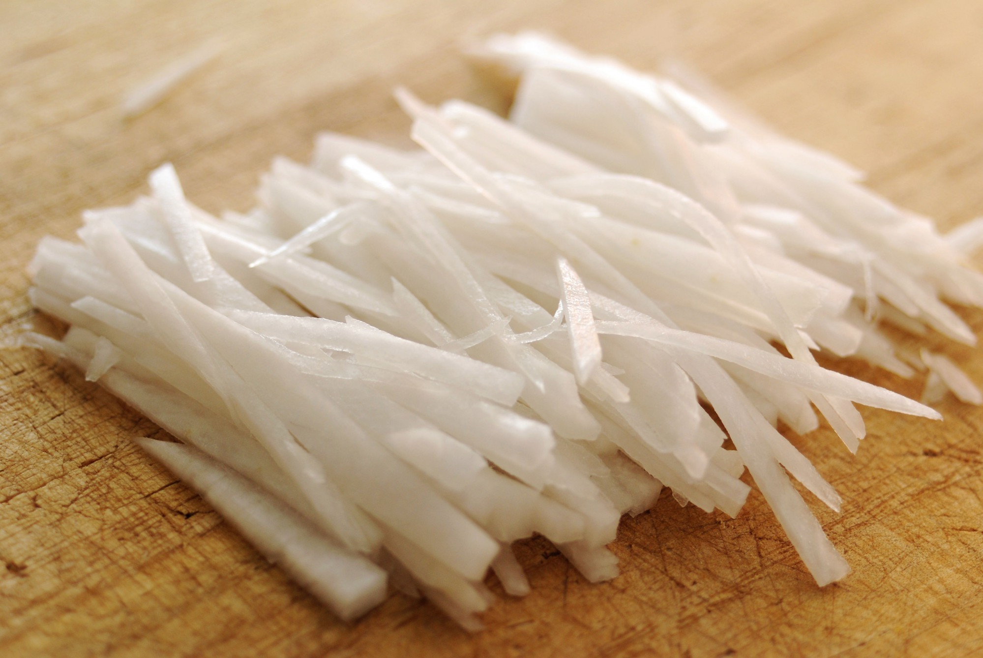 大根を細切りまたは千切りにします。まずは写真のように短冊状に切ってから細切り・千切りにするとやりやすいですよ。