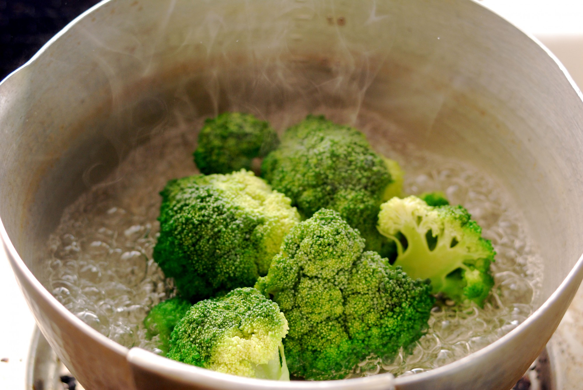 ブロッコリーを加熱する際はよく洗った後にざっと房を切り離し、鍋に並べて少しの水を注いで熱します。つぼみの部分を熱湯で茹でると白っぽく変色し、見た目がよくありません。できるだけ鮮やかな緑色を残しておくため、つぼみ部分をできるだけ湯につけないようにして茹でます。