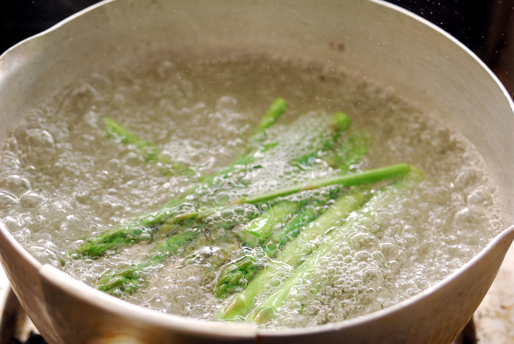 アスパラガスは根元の硬い部分を手で折り、下から5cmほどの皮をピーラーでむき、ハカマを取り除いて茹でます。茹でる際は火の通りにくい根っこの部分から茹でるようにしましょう。2~3分ほど熱湯で茹でたら十分です。