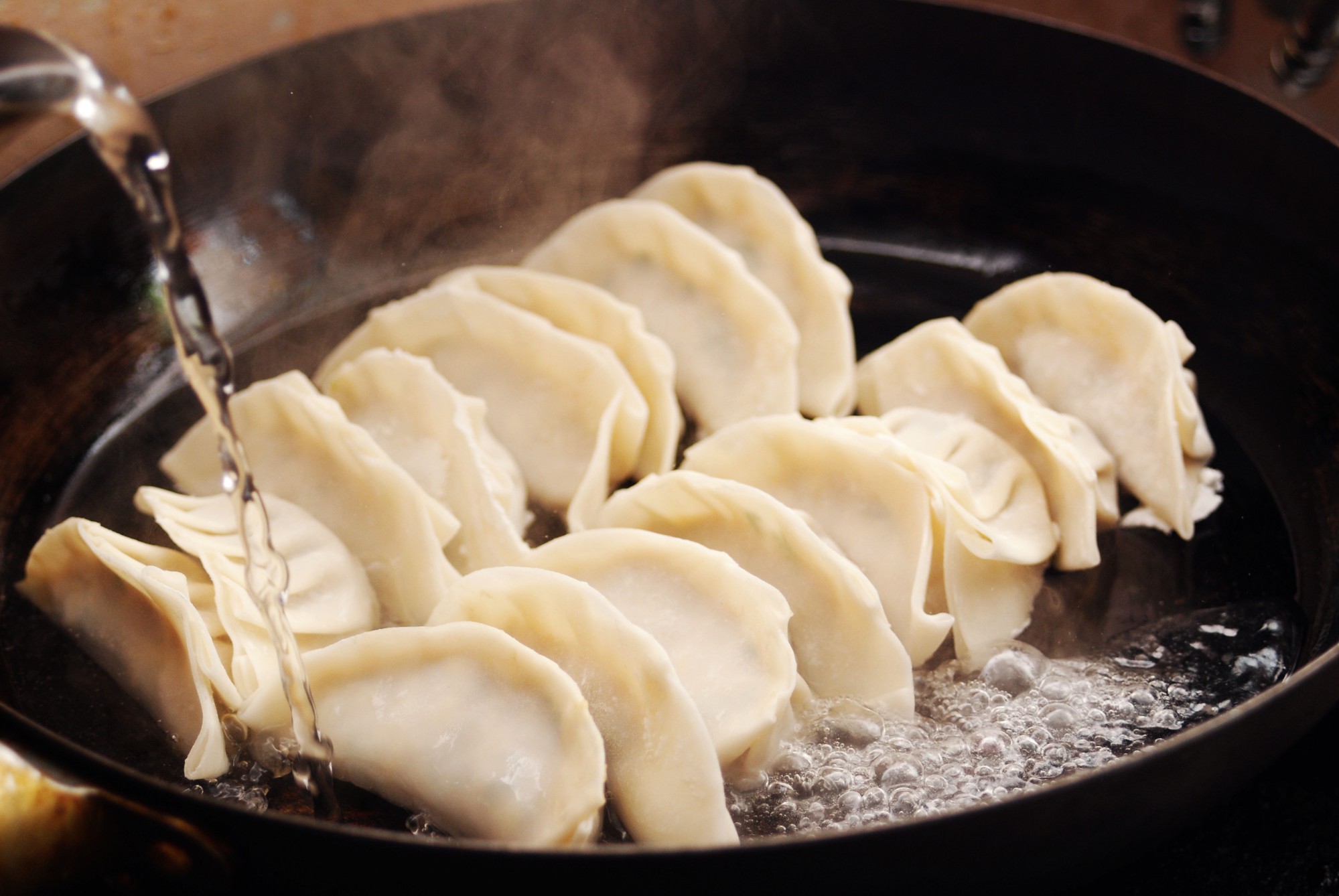 底面に焼き色がついたら餃子の1/3程度が浸かるほどの熱湯を入れてフタをし、水気がなくなるまで蒸し焼きにしましょう。