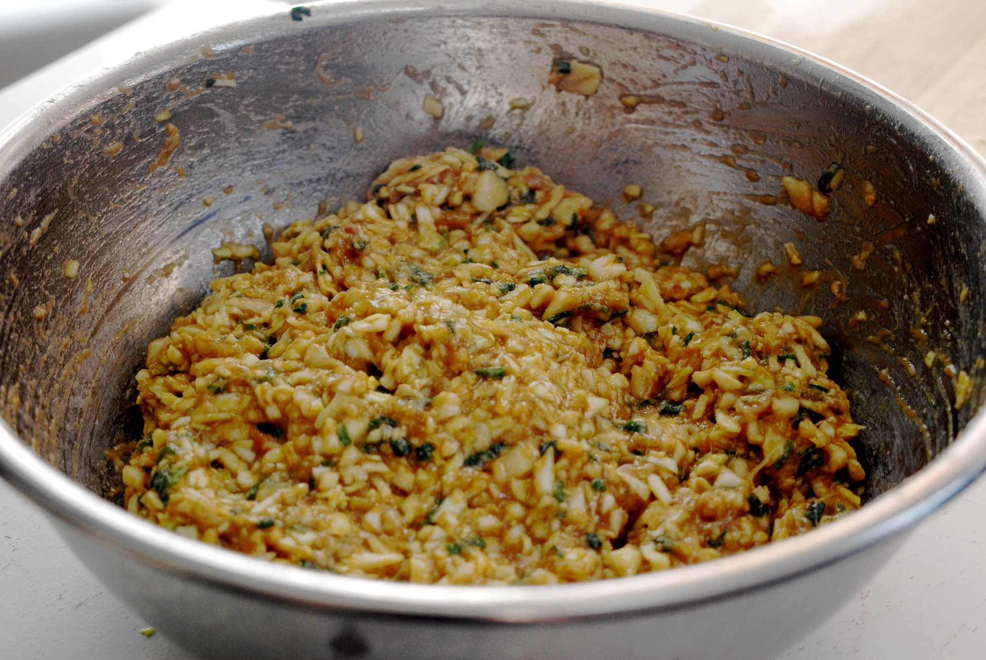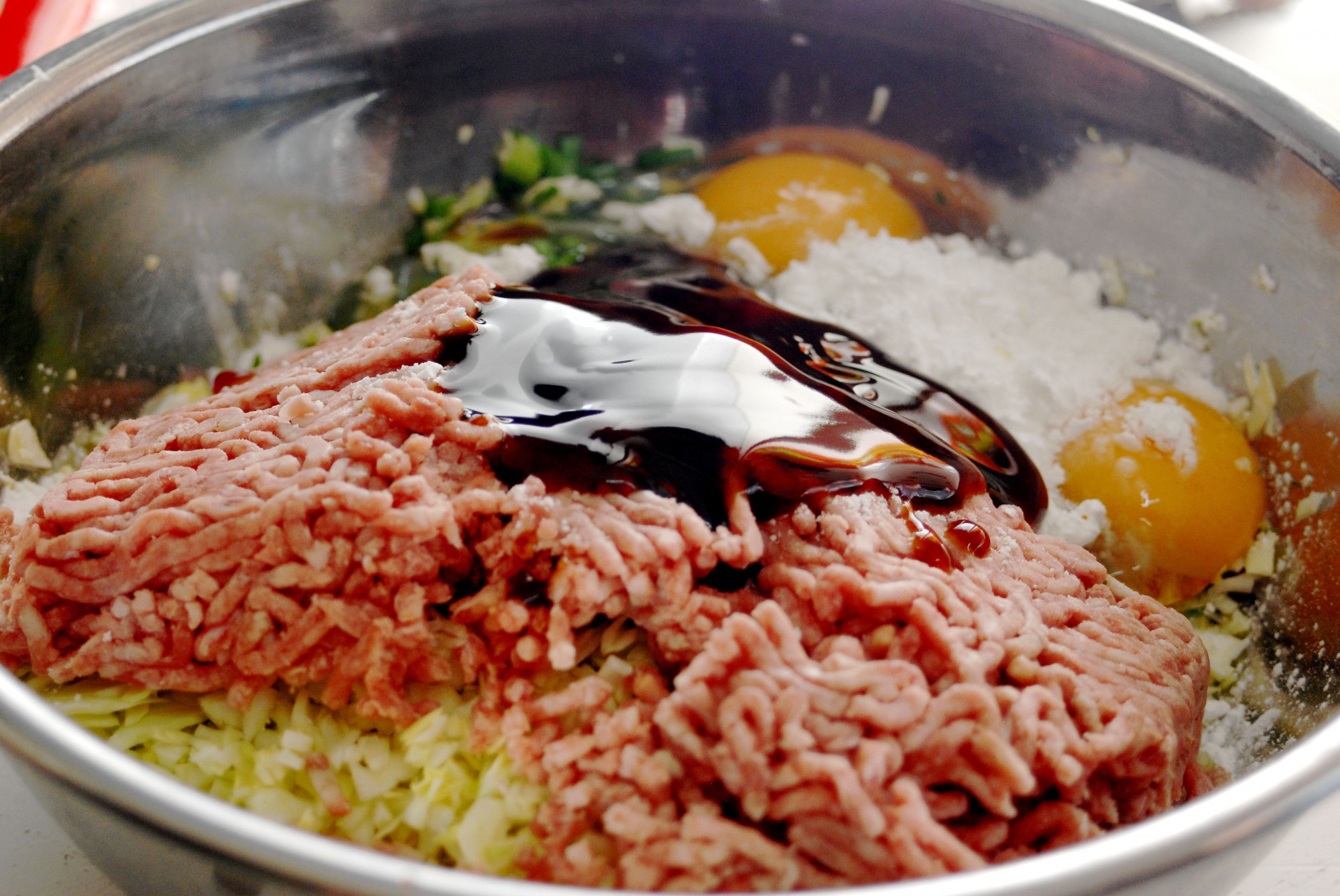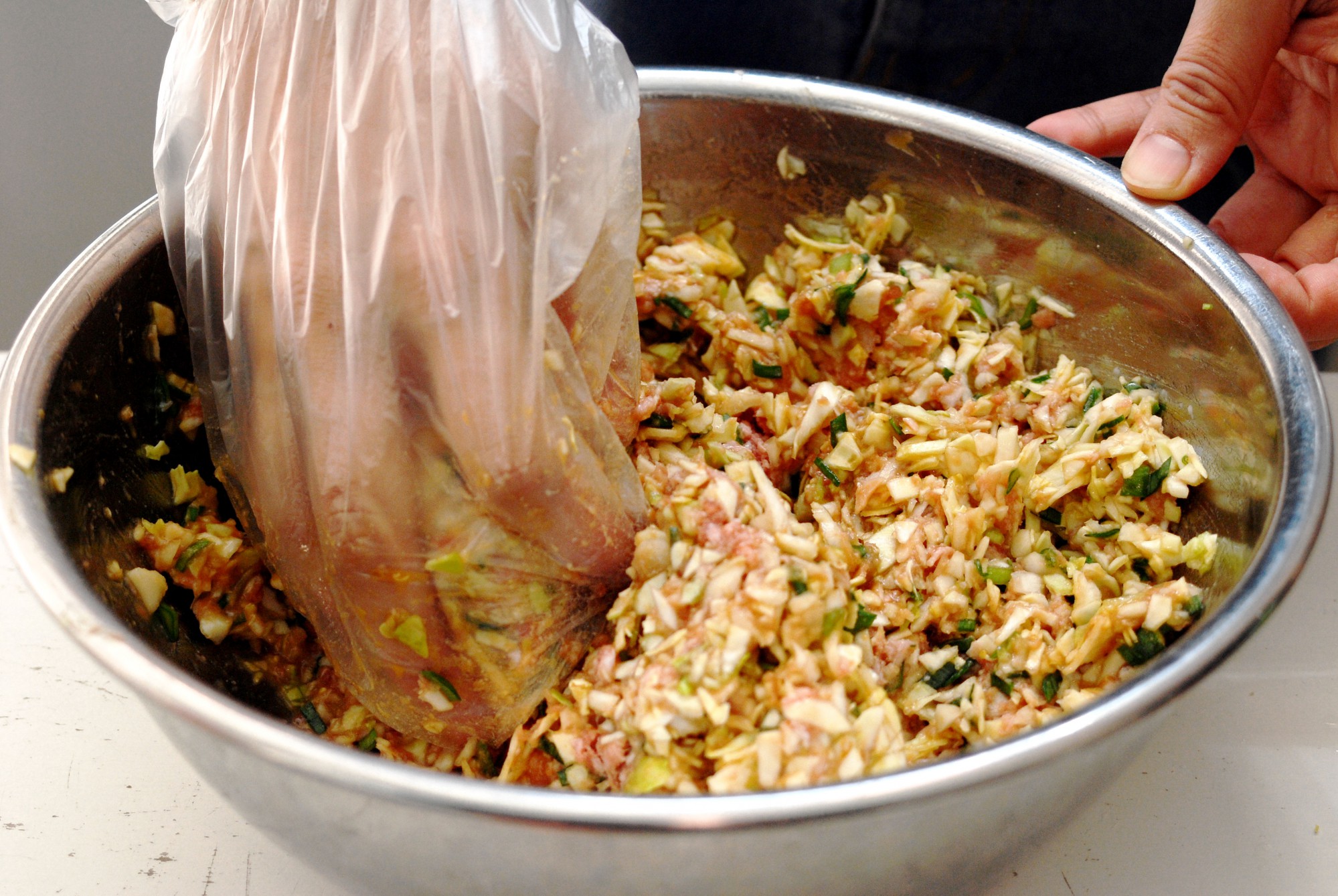 切ったキャベツとニラ、豚ひき肉、オイスターソース、卵黄、塩こしょう、片栗粉、ラード、すりおろした生姜をボウルに入れ、粘りが出るまでよく混ぜます。