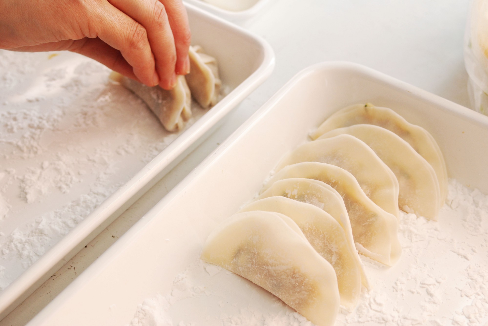 包んだ餃子は、片栗粉(分量外)を敷いたバットなどに並べていきましょう。バットに片栗粉を敷くのは、餃子がバットとくっついて皮が破けないようにするためです。