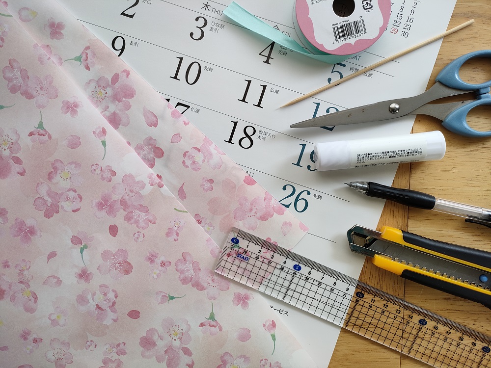 ラッピングペーパーはやや薄いので、今回は丸みを持たせるためにカレンダーと2枚重ねで作成していきます。