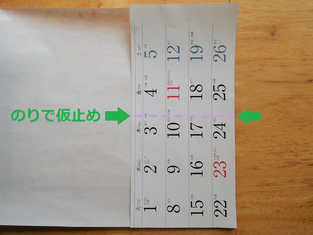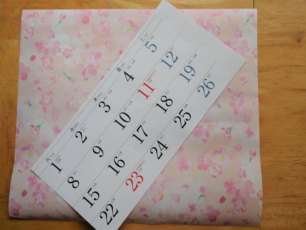 今回は2枚の紙で作っていくので、ラッピングペーパーとカレンダーを重ねておきます。ラッピングペーパーは柄の入っている面が下、カレンダーは文字の書かれている面が上向きです。