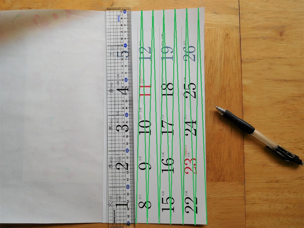 わかりやすいように緑色の線を加えていますが、実際に記入したのはシャープペンシルです。好みや作りやすさでサイズを調整してもOKですよ!