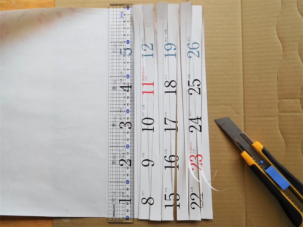 線にものさしを当て、カッターで切っていきます。下にはマットやダンボールなどを敷いておいてくださいね。カッターの扱いには注意しましょう。