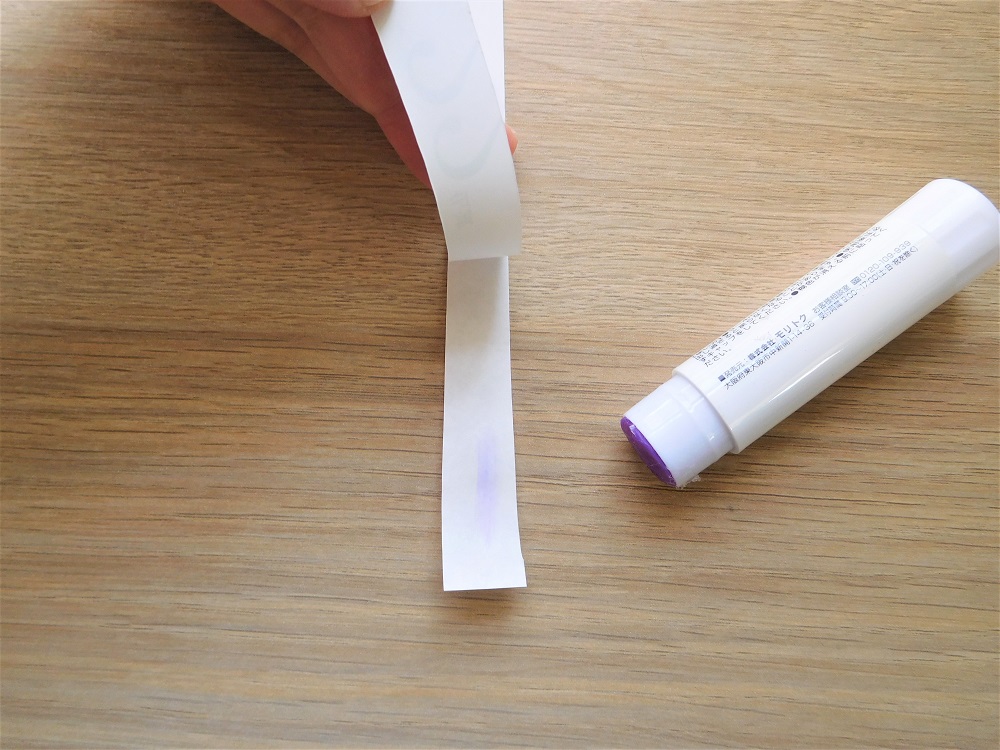 ラッピングペーパーのちょうど真ん中あたりで横一筋にのりを塗って、仮止めしておきましょう。のりはごく少量を塗って後で剥がせるようにしておきます。