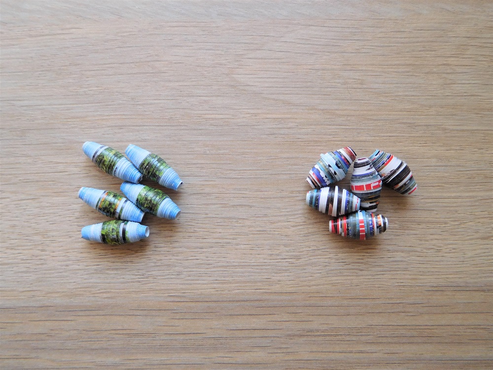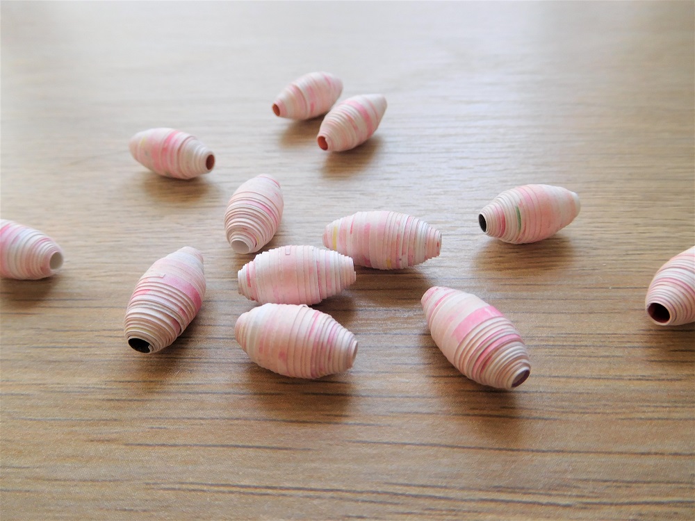 また、紙は本来の用途によって厚みが異なります。厚みのある紙で作れるのは丸みのあるビーズ、薄い紙でできるのは細いビーズです。