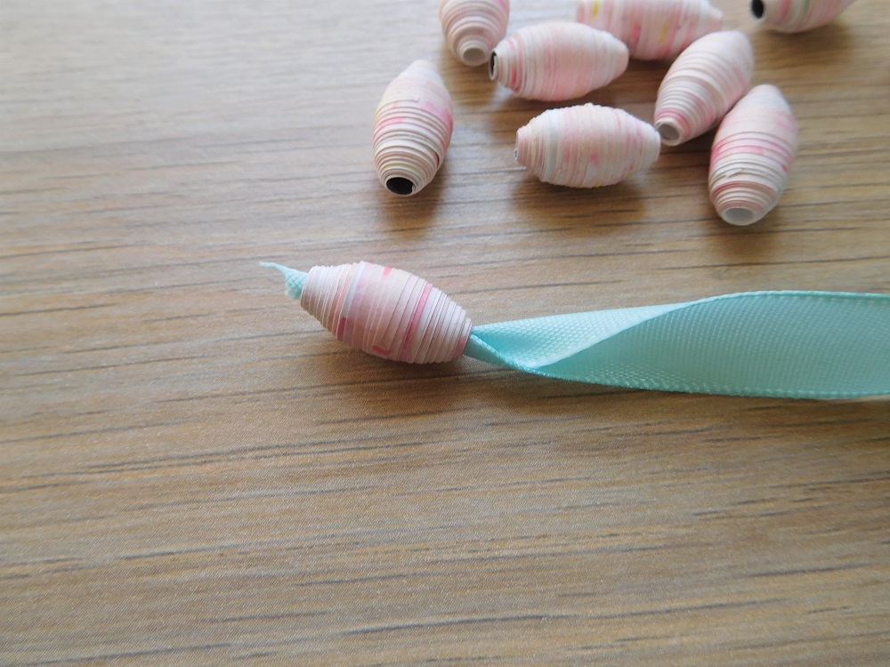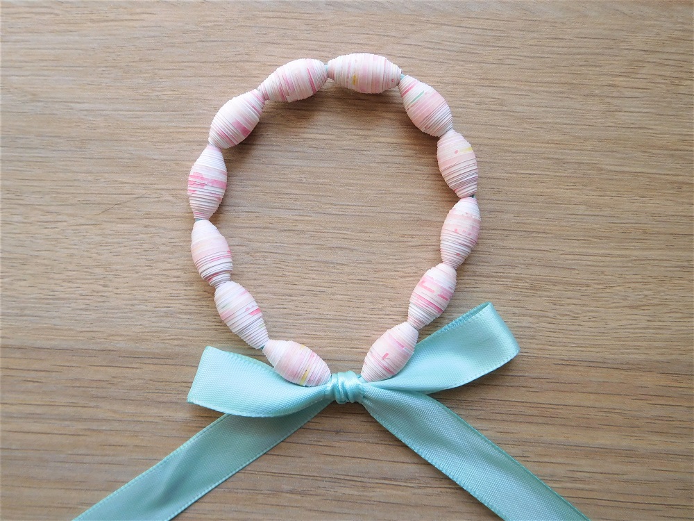 12個のペーパービーズをすべてリボンでつなげたら、両端をまとめてリボン結びにしましょう。