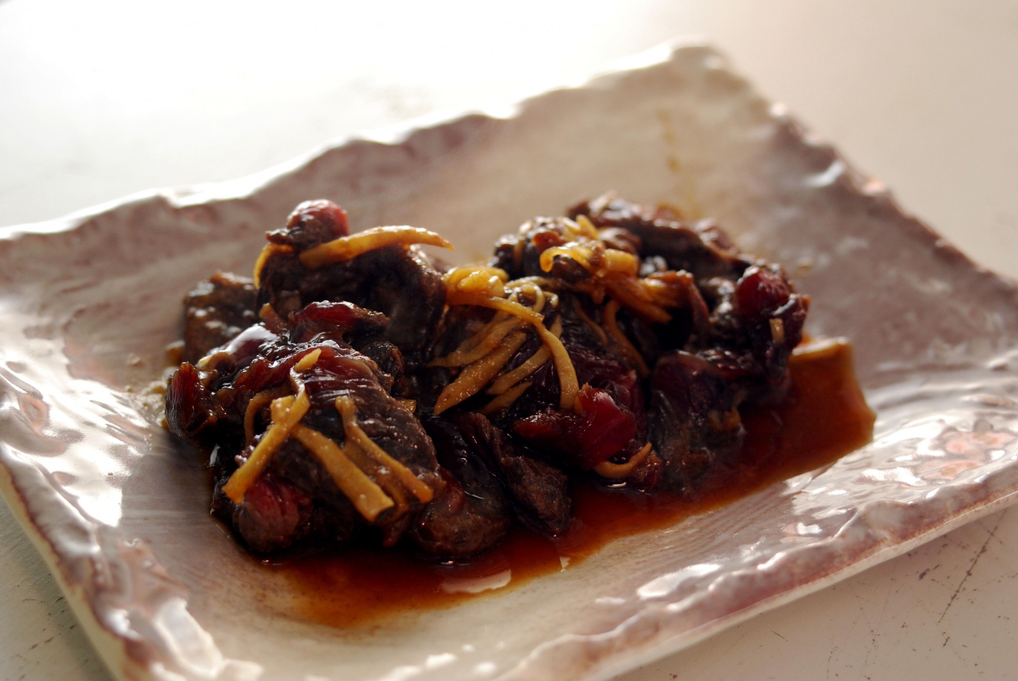 できるだけ薄めにカットしたクジラ肉を、醤油と酒、刻み生姜を合わせたたれに10分ほど漬け込んでから、サラダ油をひいたフライパンで焼くだけ。